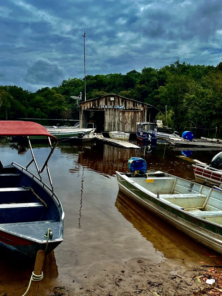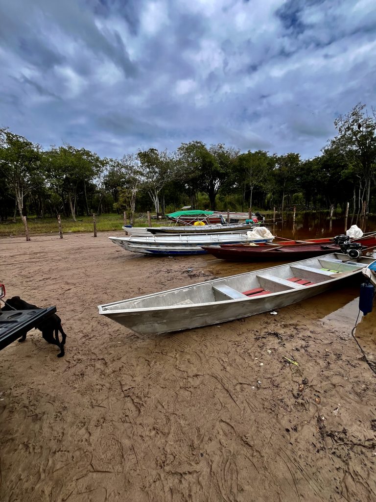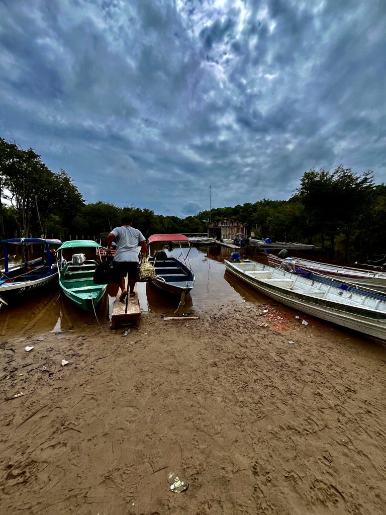 Zeitgleich holt Junior auf Geheiß seiner Mama Hundefutter aus dem Kofferraum und füttert die herbeistürmenden, herrenlosen Hunde. Dann nehmen auch wir auf dem Bötchen Platz, Fabiola ebenfalls und begeben uns auf eine zwanzigminütige Flussfahrt, auf einem Nebenarm des Rio Negros, zur Lodge.