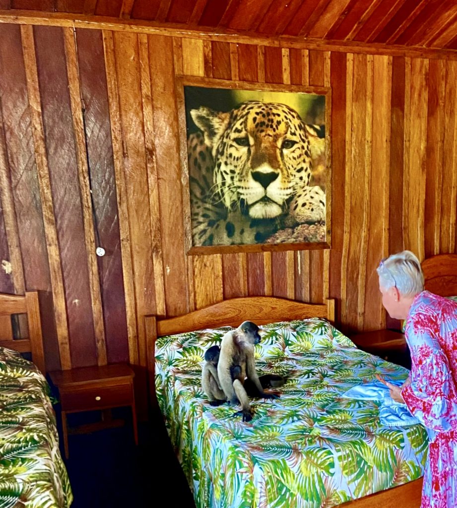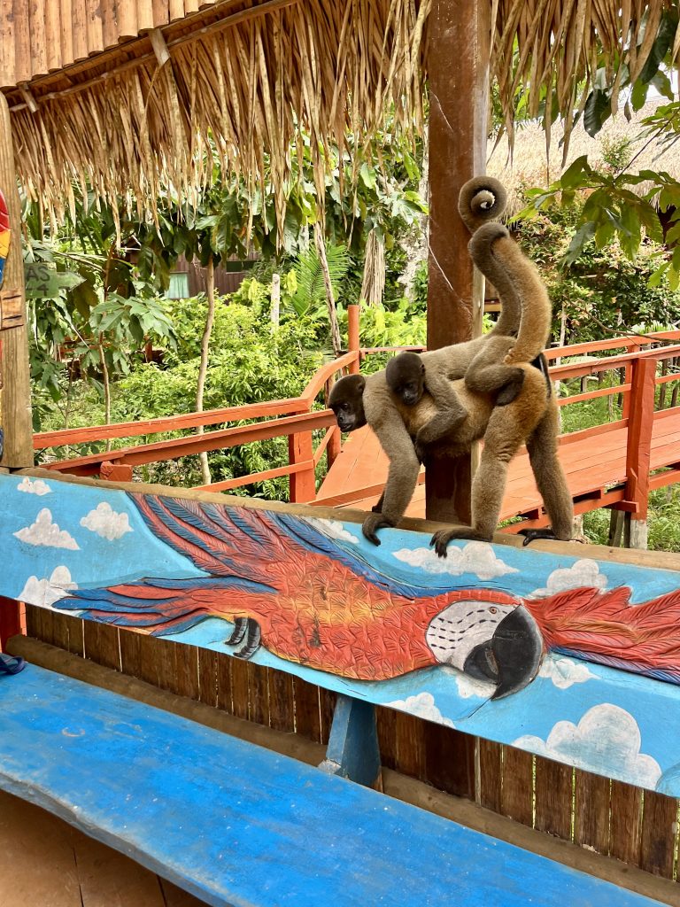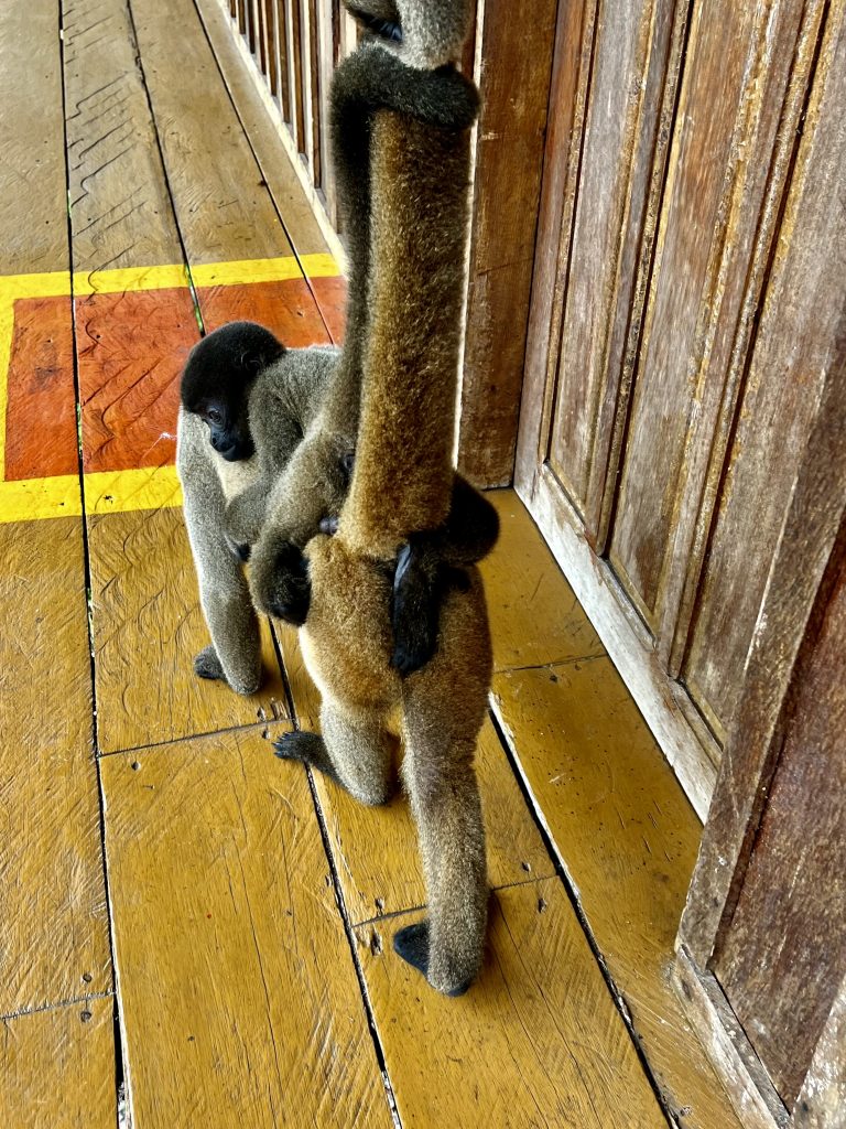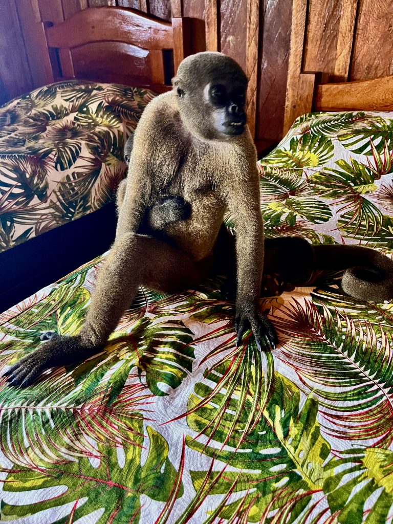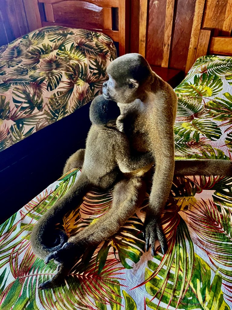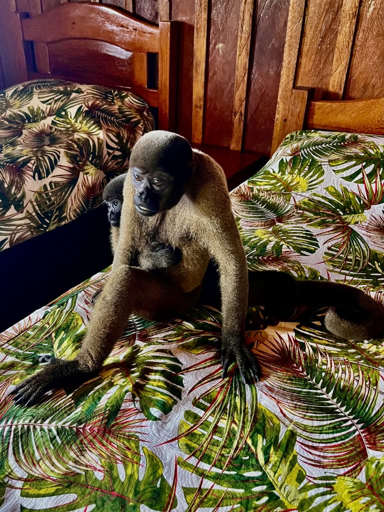 Aber wer ist denn das? Das ist die Wollaffenmama Frieda, mit ihrem Söhnchen. Sie empfängt uns neugierig❣️Sie hat wohl schon vor Jahren beschlossen, in der unmittelbaren Nähe zur Lodge zu wohnen, sagt Fabiola. Der Kindsvater turne auch irgendwo herum, mag aber seinen Sohn nicht. 🤨 Der wird ihm halt bald zum Konkurrenten.
