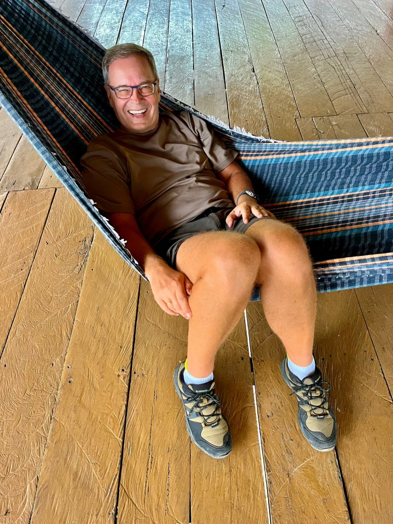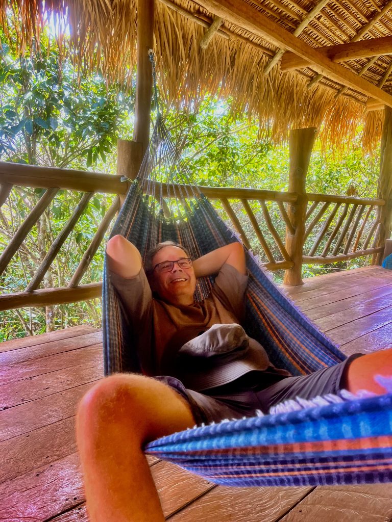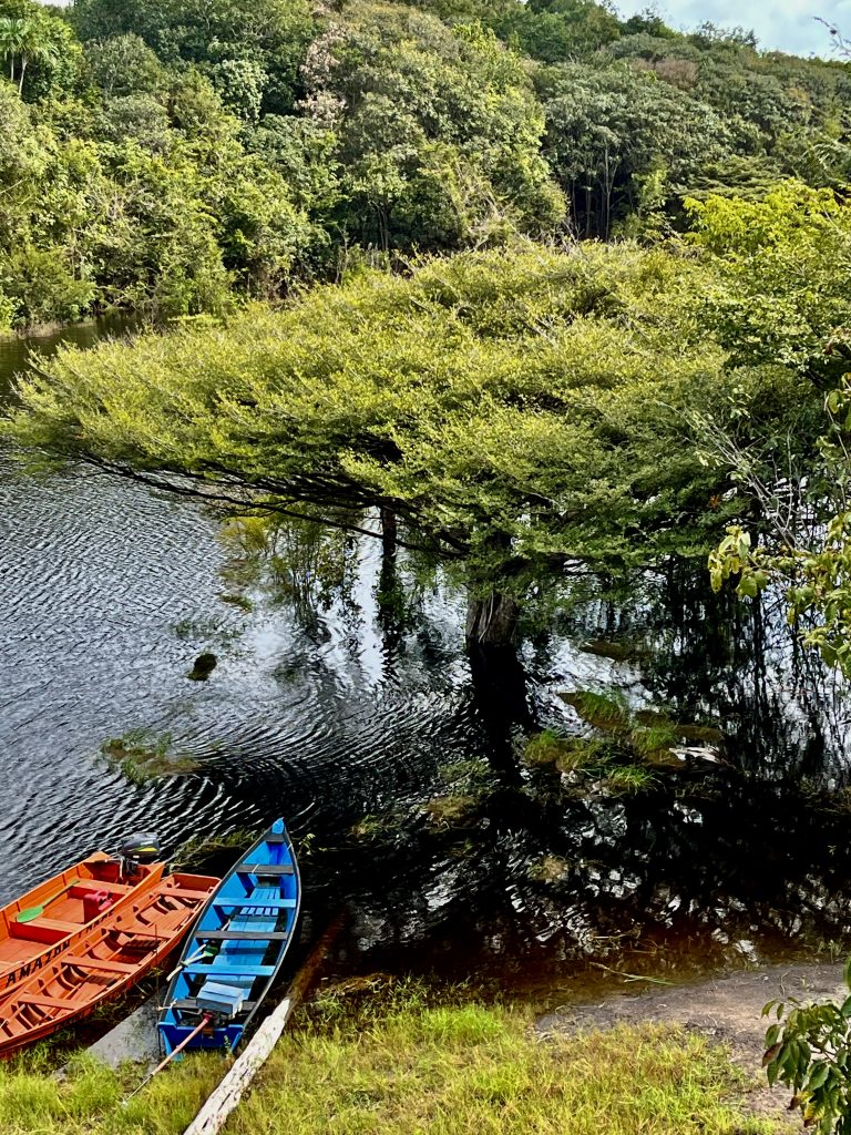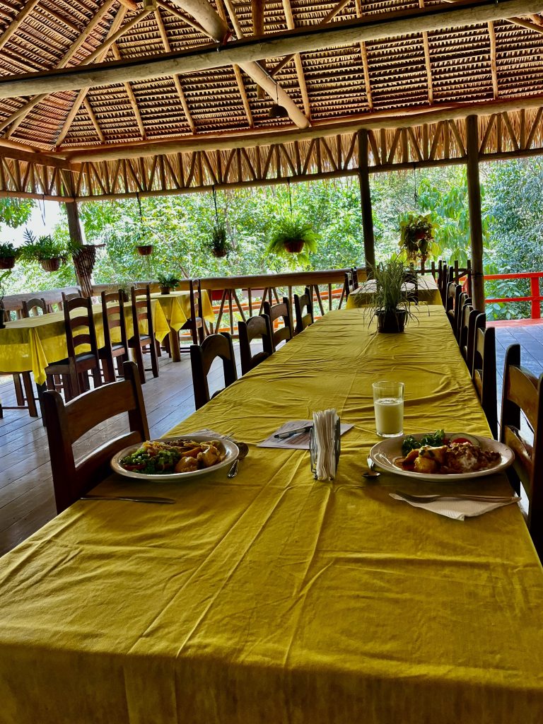 Stimmt nicht ganz, als wir kommen sind die Teller noch leer. Auf einem langen Tisch stehen ein paar Schüsselchen und Platten mit dem, was wir uns dann auf die Teller gegeben haben. Dazu noch einmal Cashewsaft und zum Nachtisch Schokoladeneis. Alles ist frisch und selbstgemacht, Bohnen, Maniok, Reis, Salat, Fisch. Das Eis von 100% echter Kakaobohne, ist von Fabiola fabriziert. Es schmeckt alles super und ist obendrein noch gesund. Klaus’ Schwester Sabine hätte an diesem Essen ihre große Freude. Wir aber auch❣️Doch wo sind denn die anderen Gäste? Nee, keine anderen Gäste, nur wir. 😳 Alles ist nur für uns gemacht. 😁 Das hatten wir auch schon mal in Namibia, grins. Wie damals dort, so ist jetzt auch hier Nebensaison. Fabiola und Nixon sitzen auf einer Bank im Raum, unterhalten sich leise und achten auf uns, falls wir etwas wünschen. Etwas komisch das Ganze! Nixon sagt, wir könnten nachher in der Meditationshütte in den Hängematten chillen. Das werden wir tun. Da kommt ein großer, roter Papagei geflogen und hopst in den Küchenbereich, von wo er lautstark vertrieben wird. Eine Sekunde nachdem wir mit dem Essen fertig sind, wird alles zackigst ab- und weggeräumt. Nixon kündigt noch unseren Nachmittagsausflug „Bootstour über den Fluss“ an, Treffen um Punkt 15:15 Uhr in der Empfangshütte. Aye, aye, Captain🫡!