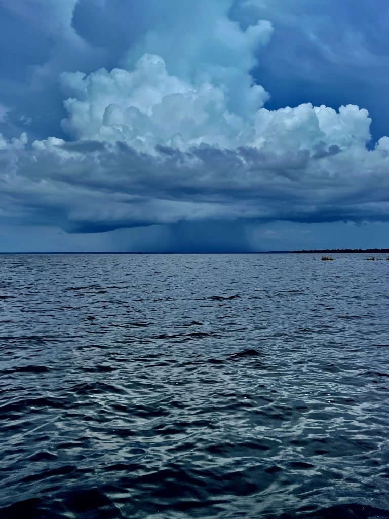 Wir sind mit einem der Boote ohne Dach unterwegs, und dahinten kommt schon ordentlich was runter.