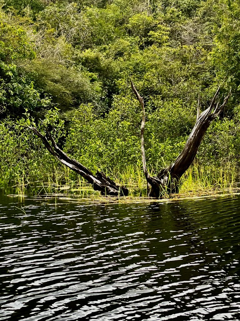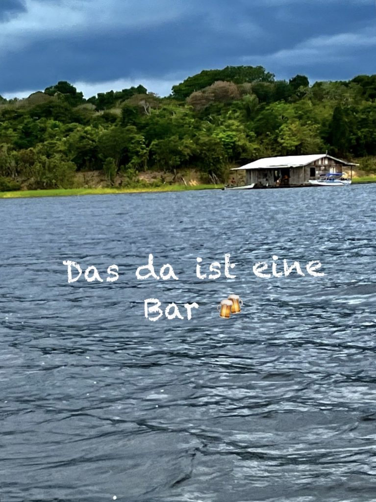 Jetzt fahren wir wieder in einen Flussarm hinein, auf der Suche nach Faultieren. Faultiere sind strenge Einzelgänger, und Germano gibt immer wieder einen bestimmten Pfeifton von sich. Der soll dem eines Faultieres ähneln und dieses aus seiner Ruhe reißen. Erstmal sehen wir aber kein Faultier, eher tolle, im Wasser stehende Bäume, ein paar kleine, graue, kompakte Delphine und diese im Wasser schwimmende Bar. 😝