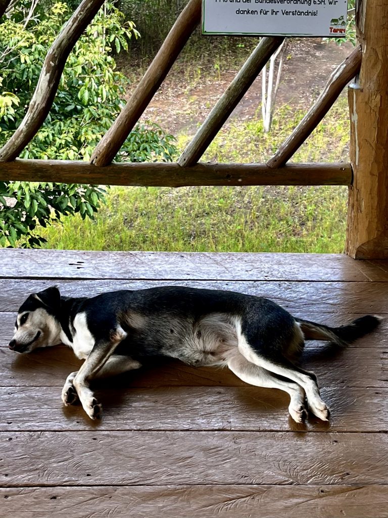 Zwei Haushunde begrüßen uns kläffend. Wobei, eigentlich nur einer, der andere zieht das ausruhende Nickerchen vor.