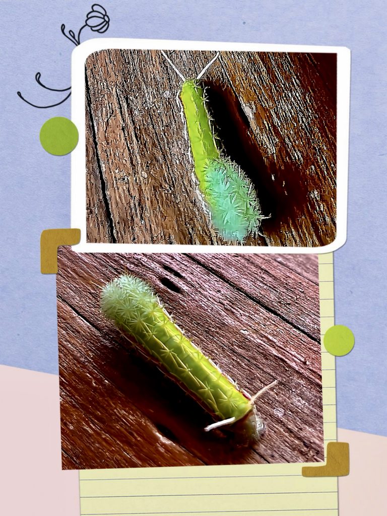 Fabiola meinte noch, dass es hier, am Rio Negro, fast keine Mücken gäbe. Nicht so wie am schlammigen Amazonas. Das wäre ja schön. Dafür finde ich eine interessante Raupe auf dem Geländer.
