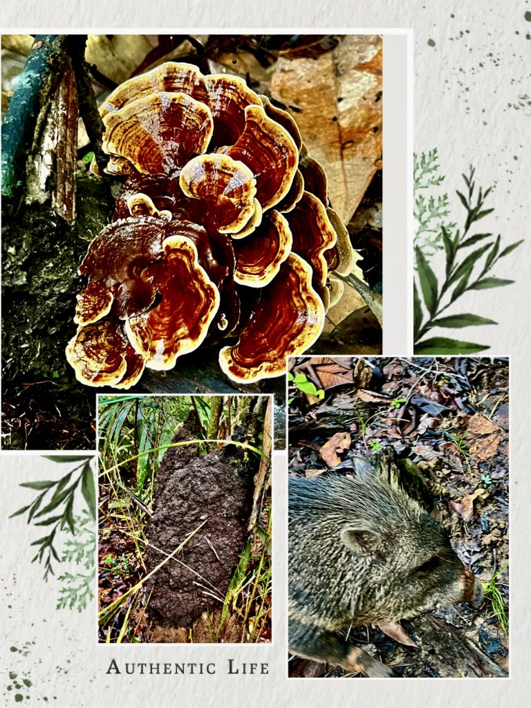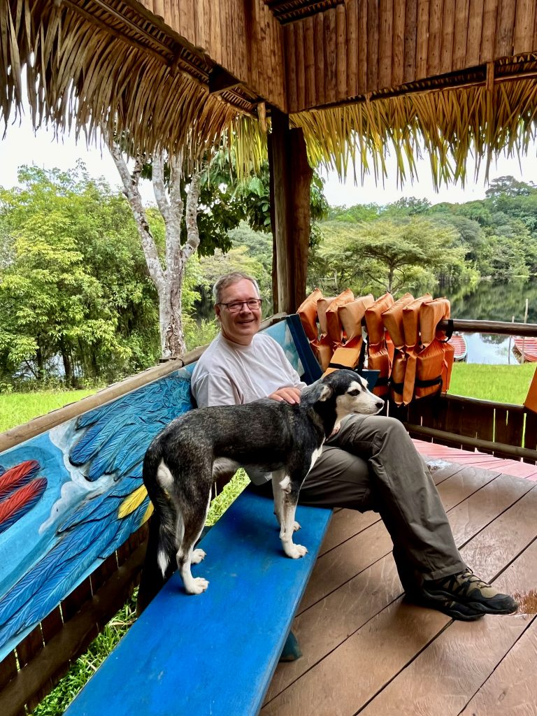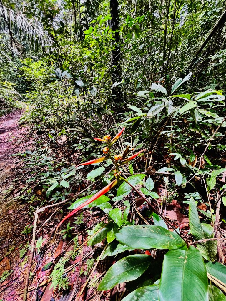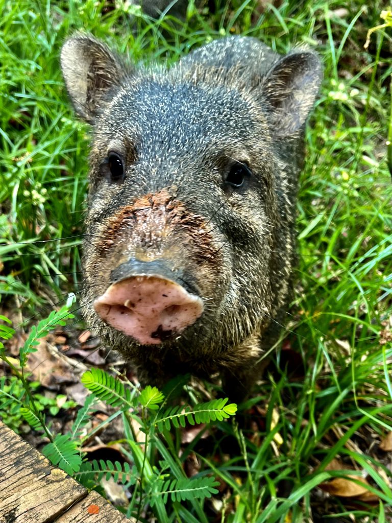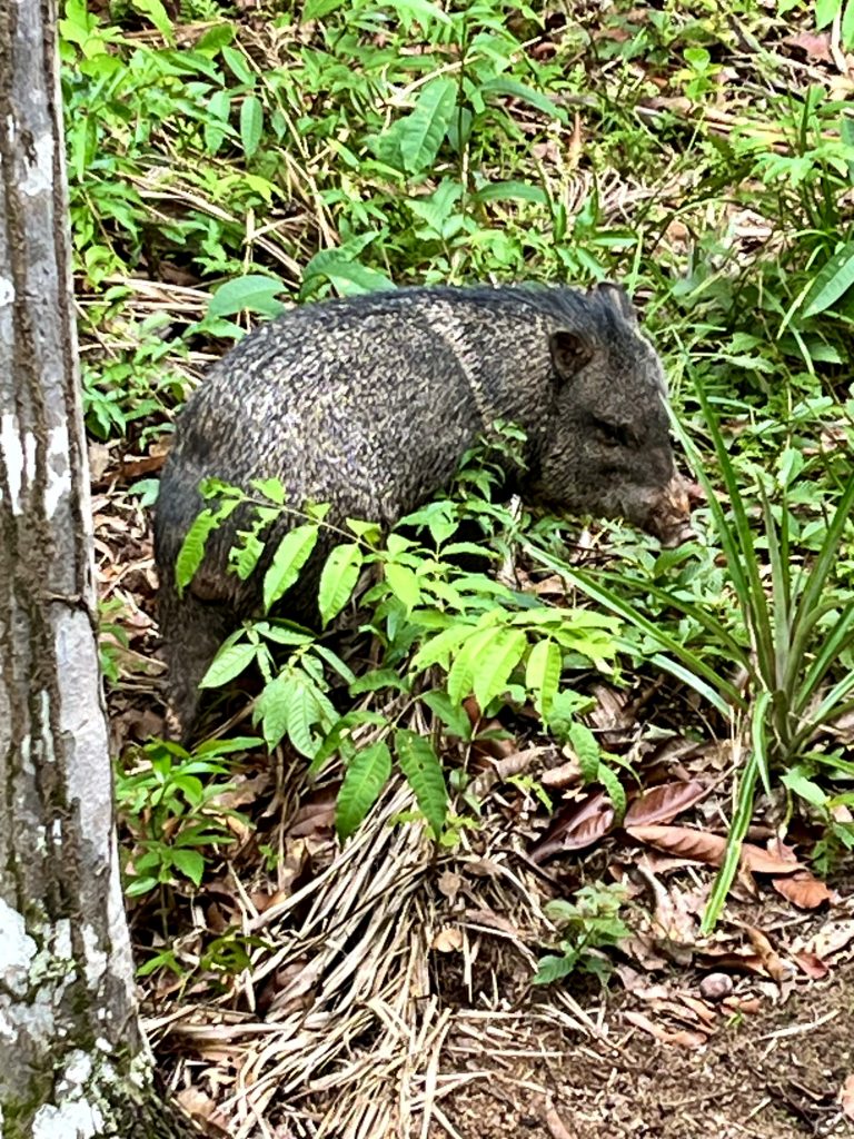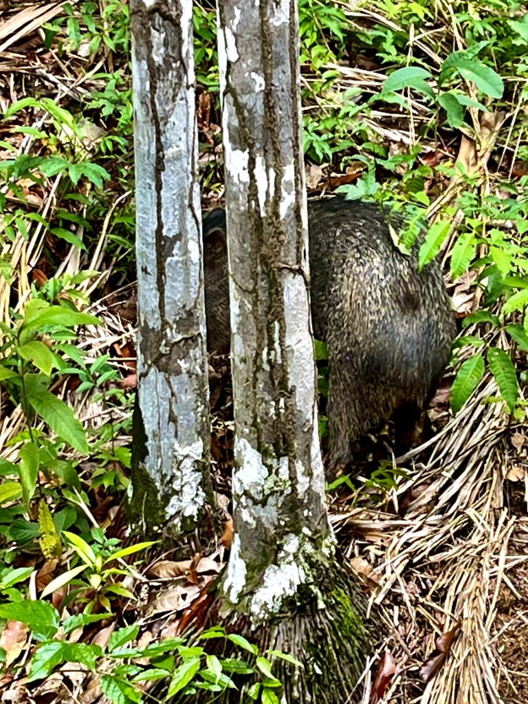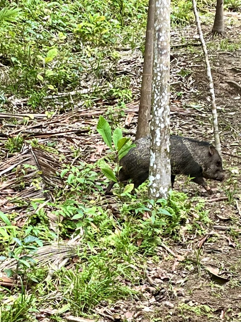 Die Dschungelwanderung steht an. Wer kommt alles mit? Alle! Aber wirklich! Wir 8 Gäste, Germano, seine 2 Hunde, 1 Wildschwein und Frieda mit Sohn und Mann. Echt jetzt? Ja, echt! Gleich bei unserem Aufbruch, direkt an der Lodge