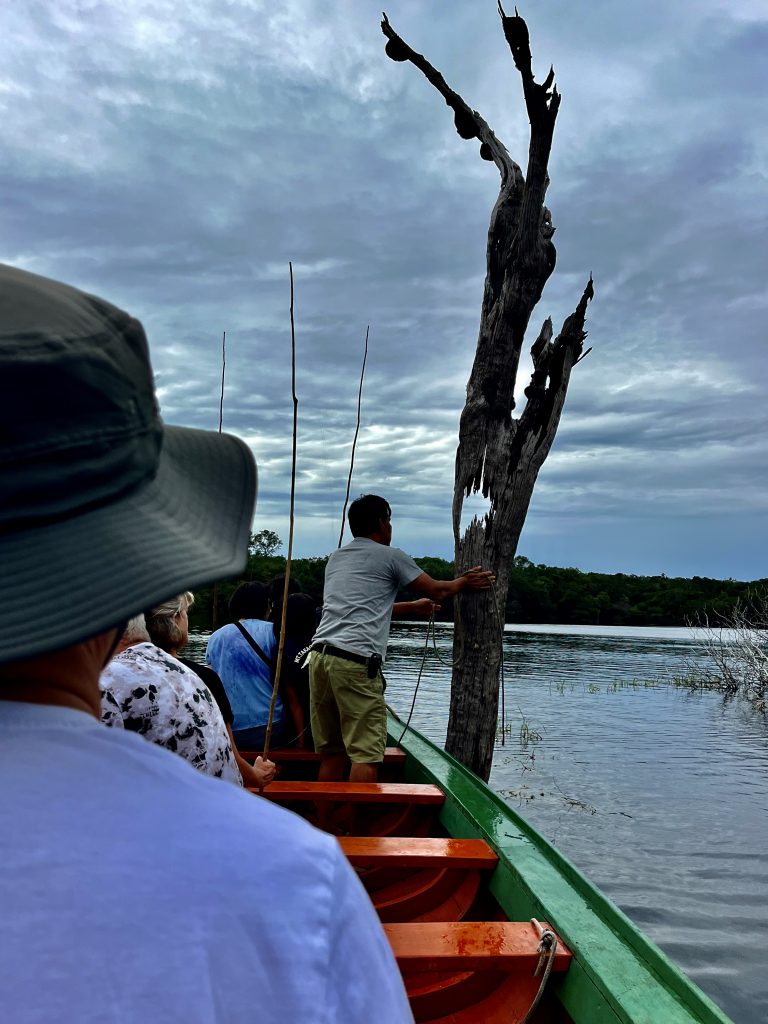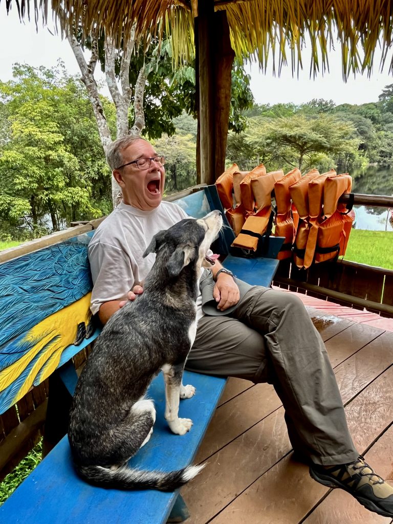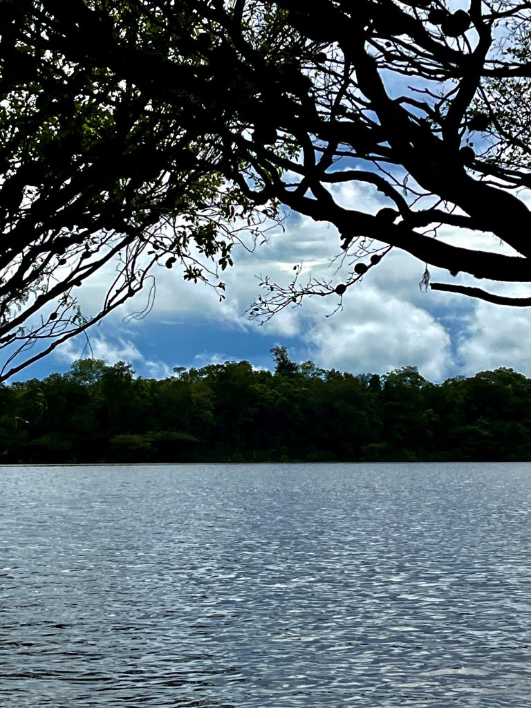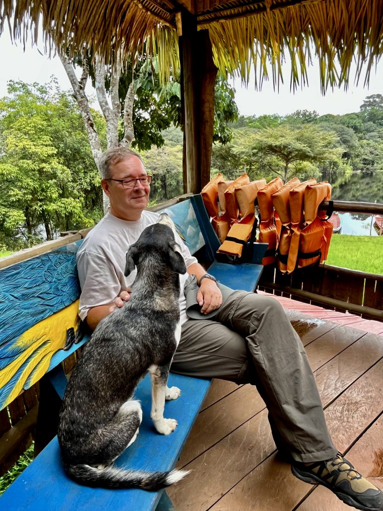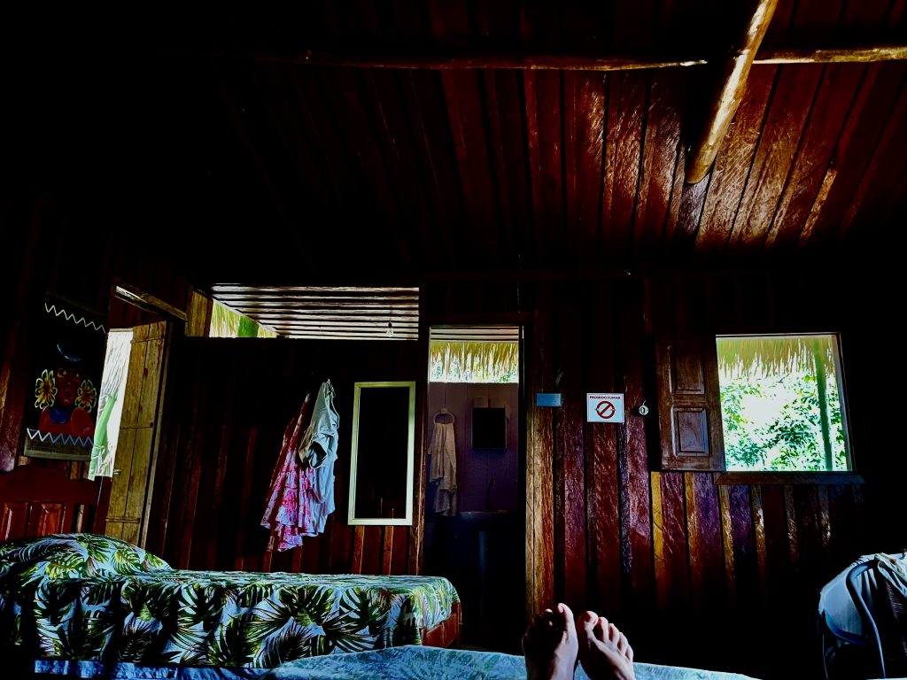 Komisch, dass die keinen Notstromaggregat haben? 🤔 Das Glöckchen klingelt. Im allerletzten Tageslicht laufen wir zur Speisehütte. Auch dort gibt’s kein Licht, kein Aggregat brummt. Ein Handy und 2 Taschenlämpchen leuchten verzagt vor sich hin. Wir 4 Deutschen setzen uns jetzt zusammen, um uns gegenseitig zu leuchten. Erst später bringt Nixon endlich ein paar Kerzen für die Tische. Unser Tischnachbar ist etwas verdattert. Er brauche Strom für die Nacht, schläft er doch mit Atemmaske wegen seiner Atemaussetzer. Hm, ob das noch was wird. Fabiola, Nixon oder Germano äußern sich gar nicht zur Situation. Nur so viel, die ganze Region hat keinen Strom. Ende der Information. Wir konzentrieren uns erstmal auf das Essen. Die Mengen sind überschaubar, oft ist das ein oder andere genau abgezählt. Zum Beispiel 8 Brötchen zur Suppe, 8 Spiegeleier zum Frühstück, 8 Minischälchen Nachtisch. Wer sich da zu viel Zeit lässt, könnte auch schon mal bei den Süßkartoffelpommes leer ausgehen. Es wird nicht nachgefüllt. Stattdessen sehr schnell abgeräumt. 😶 Die gefangenen Fische gibt es nicht. Doch heute bleiben wir 4 einfach etwas länger sitzen. In unseren Hütten haben wir kein Kerzenlicht, kein gar nichts. Die Japaner sind da besser ausgerüstet. Sie haben ne fette Powerbank samt Lichtstrahler, sauber!👌 Nixon kommt an unseren Tisch und knallt mir das Gästebuch vor den Latz. Hoppla… Ich schreibe mein Sprüchlein, aber auf Deutsch, hö,hö,hö. Fabiola kann ja ein bisschen. Dann tapern auch wir 4 langsam und vorsichtig, im stockdunklen, zu unseren Hütten. Nicht ganz ungefährlich! Nichts wird uns mit auf den Weg gegeben. Keine Kerzen, keine Taschenlampen, nichts. Auch unser Tischnachbar muss die Nacht ohne Atemmaske überstehen. Die nassen Kleider bleiben nass. Wir versuchen uns im Dunklen zu waschen, unsere Handys haben nicht mehr viel Power. Es ist kurz nach 20:00 Uhr, wir liegen auf unseren Betten, es ist warm und schwitzig, und wir lauschen den Geräuschen der Nacht. Zikaden, Brüllaffen, Vögel und Papageien haben noch was zu sagen. Auch die Hunde unterhalten sich eine Weile, dann schlafen wir ein.