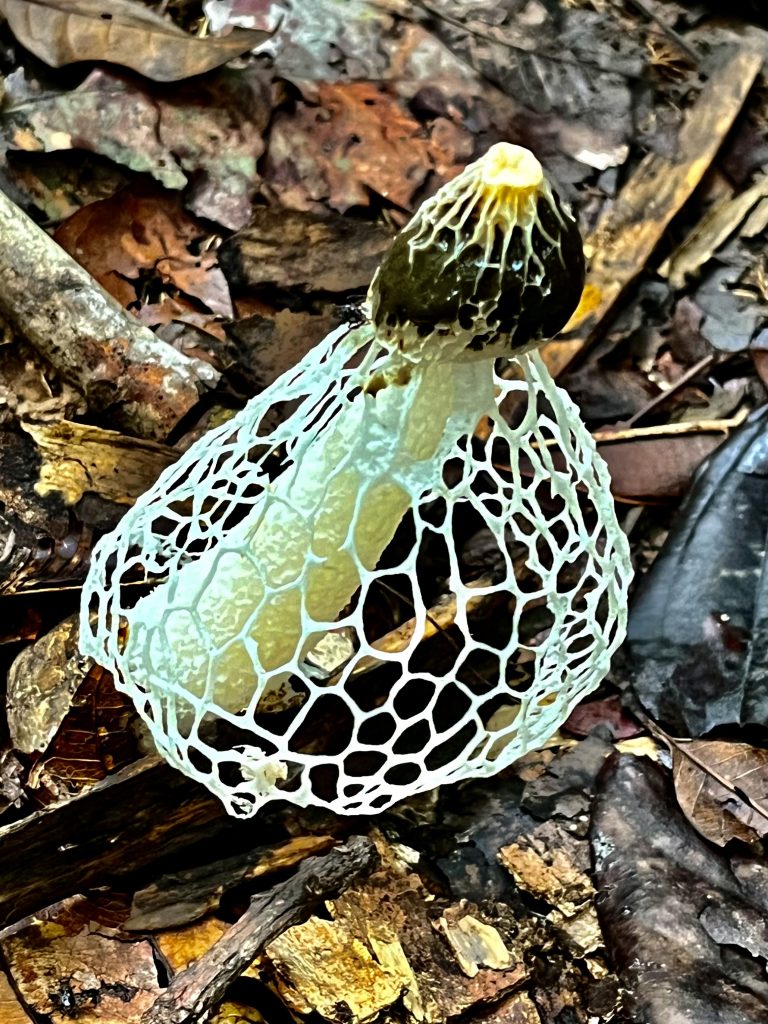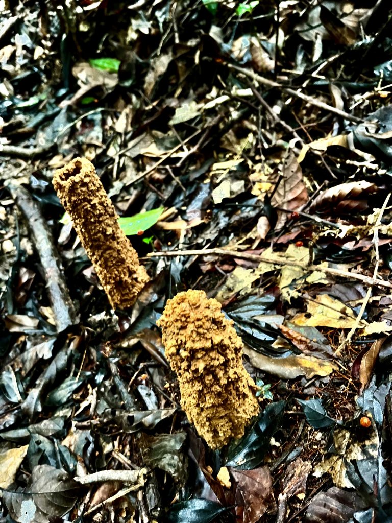 Das sind Zikadennester! Sind sie oben geöffnet, sind die Zikaden geschlüpft, wie beim hinteren Nest. Sind sie geschlossen, hocken die Zikaden noch drinnen. Nach dem sichtbaren Teil, geht es noch einen Meter in die Tiefe. Wow! Übrigens, wir sind nass bis unter die Haut. Wir haben Wasser in den Schuhen, in den Augen, durch die Brillen ist nicht mehr viel zu erkennen, nasser geht’s nimmer! Kann man diese Pilze nun essen?