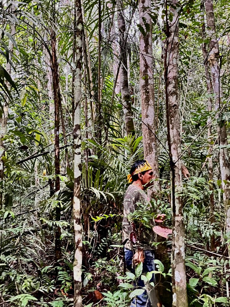 Ich weiß es nicht mehr, habe nicht zugehört, Wasser im Ohr… 🙉. Es gibt aber noch was anderes zu probieren. Germano schlägt mit seiner Machete etwas Nussartiges auf, drinnen hockt ne dicke, fette, weiße Made. Wer probiert? Ähhh, Klaus? Drei Maden sind im Angebot. Klaus bekommt eine, eins der japanischen Mädchen und deren Mutter auch. Hamm, und weg damit. Klaus ist begeistert!!! Die schmeckt wirklich gut! Irgendwie nach Kokos, lecker. 😋 Darauf jetzt ein Kaugummi. Germano schlägt leicht an den Stamm einer Kaugummi-Palme und sofort tritt ein weißer Saft heraus. Abwischen, in den Mund stecken und taraaa, da ist ein kleines Kaugummi im Mund. Toll! Klaus meint trocken (auf Englisch) und jetzt machen wir alle eine Blase. Germano lacht sich kaputt. 😂 Er bekommt sich kaum wieder ein. 🤣 Nicht vergessen, es schüttet ohne Unterlass. Die Affenfamilie hat sich übrigens schon länger verabschiedet. Den Wollaffen war das mit dem Regen wohl doch nicht so genehm. Tja, das ganze Wollkostüm wieder trocken bekommen, ist ja auch ne Aufgabe. Aber das Schwein ist nach wie vor mit dabei, wie auch die Hunde. Sollte Germano verlustig gehen, das Leben ist ja voller Überraschungen, dann sollen wir uns an das Schwein halten, das kenne den Weg. Okay 😆! Dann gibt es noch eine kleine Einweisung ins Dschungeltelefon.