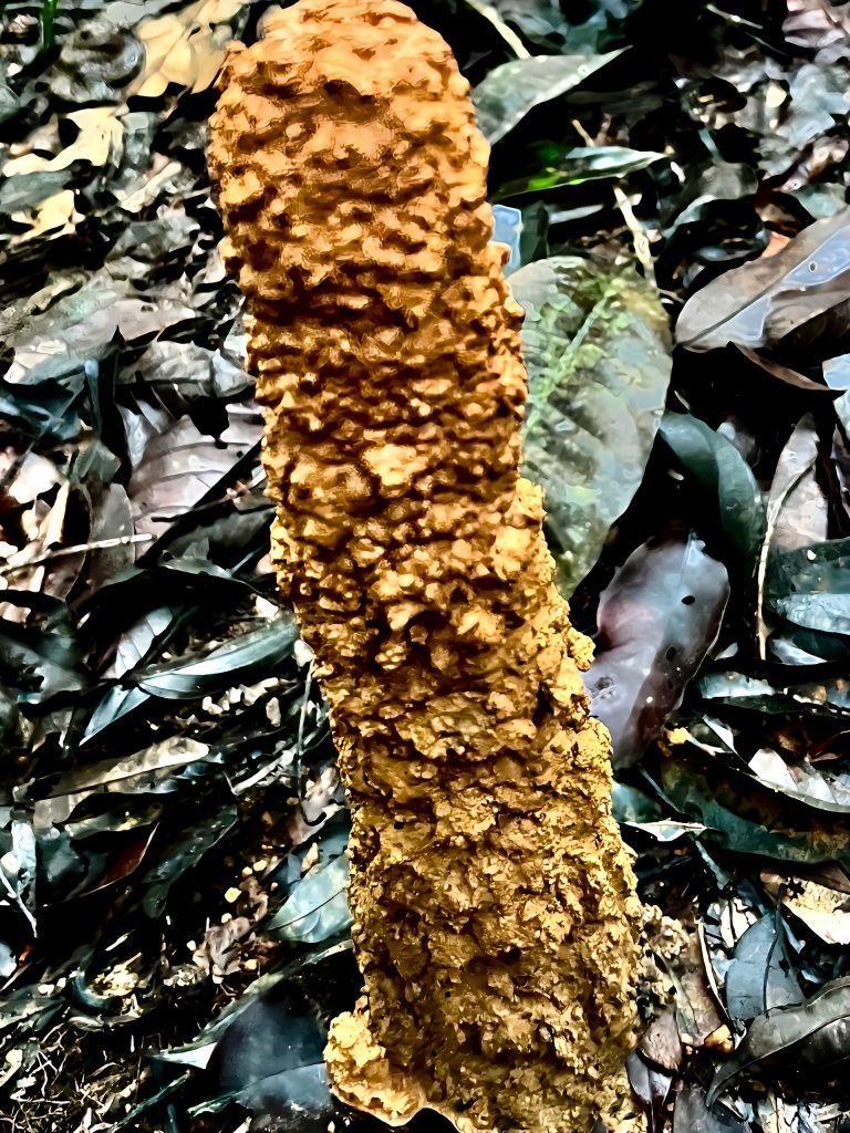 Wir stolpern, rutschen und schliddern zurück. Vorbei an weiteren Pilzen, an hunderttausend Termitenbauten und treu dabei, das Schwein.