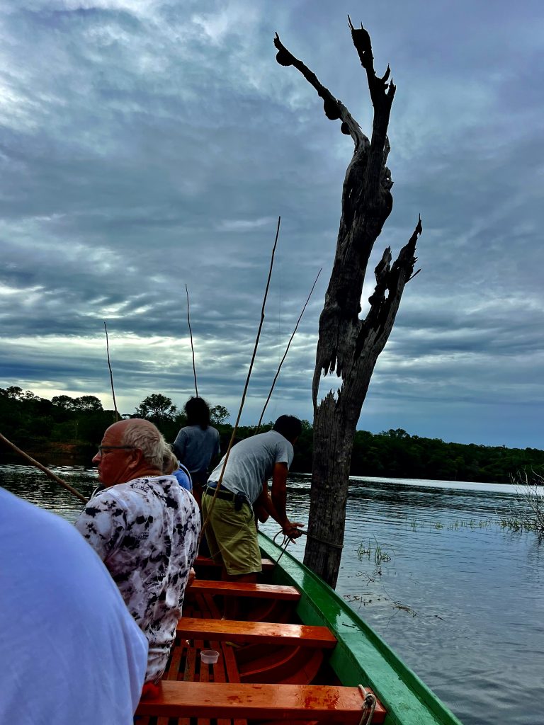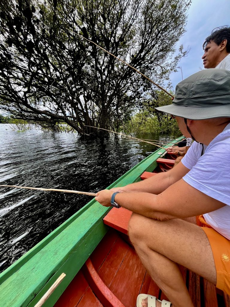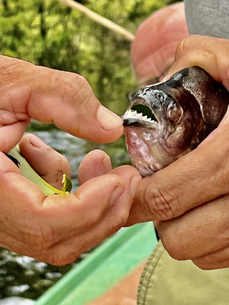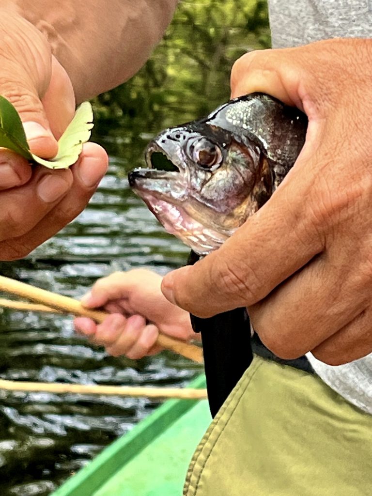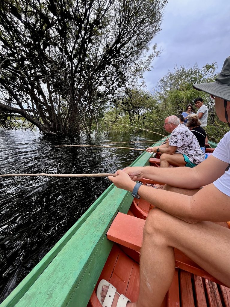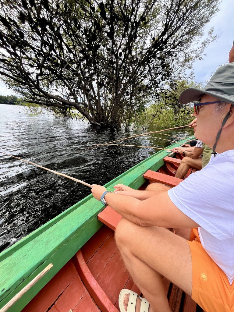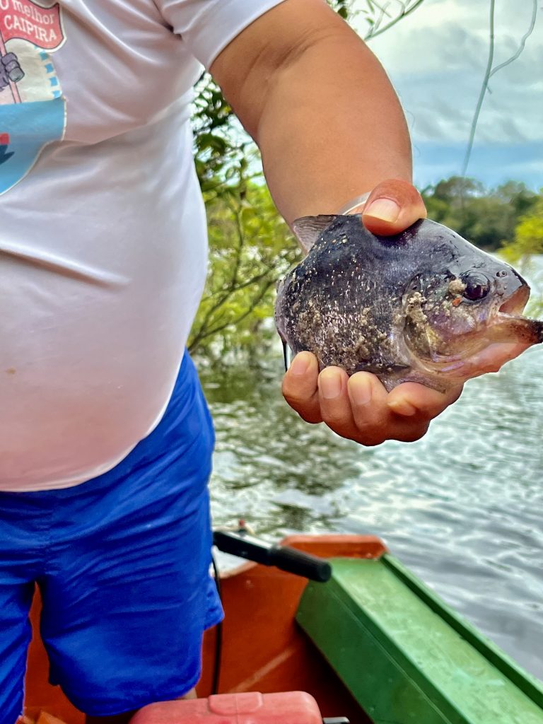 Im gesamten Amazonasgebiet gibt es Piranhas. Sie sind aber für den Menschen nicht gefährlich, sagt Germano. Wir stehen nicht auf ihrem Speiseplan. Anderslautende Geschichten entstammen Hollywoods Gruselkabinett. Na gut. Nun ziehen auch die anderen nach und nach einen Piranha heraus. Alle sind klein, manche noch kleiner. Alle landen sie in einem Eimer.
