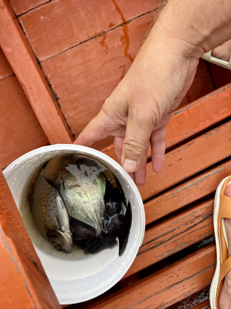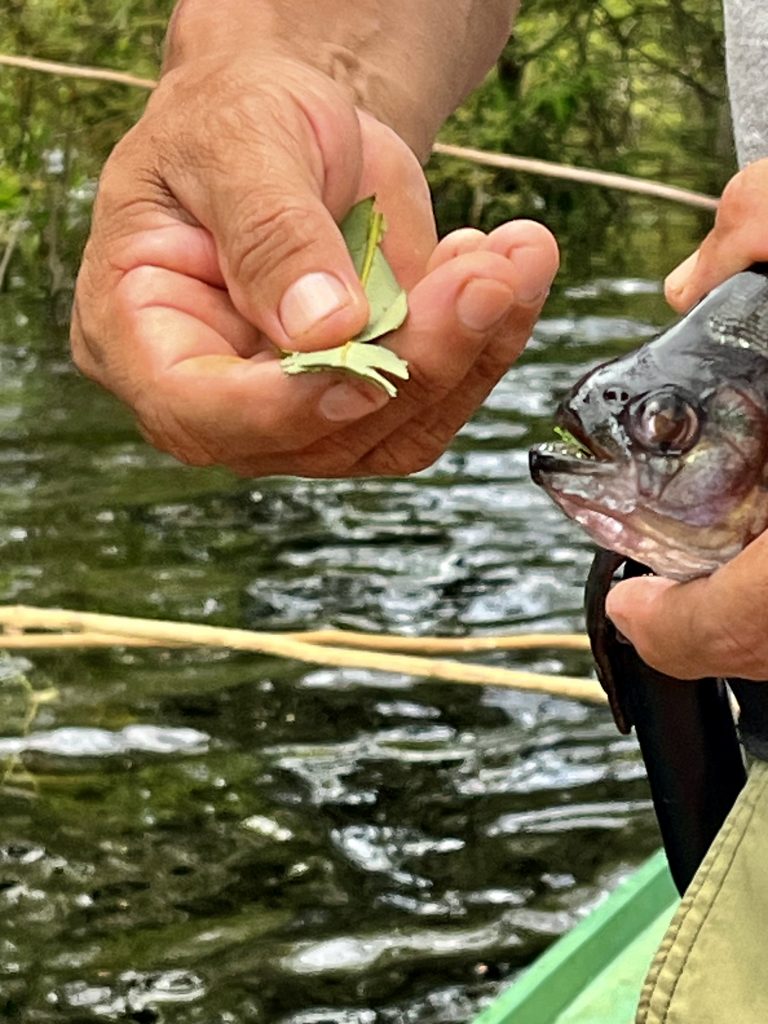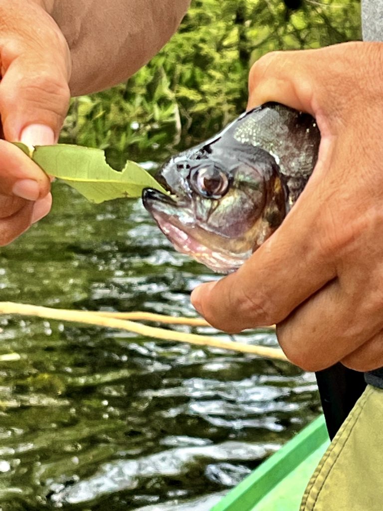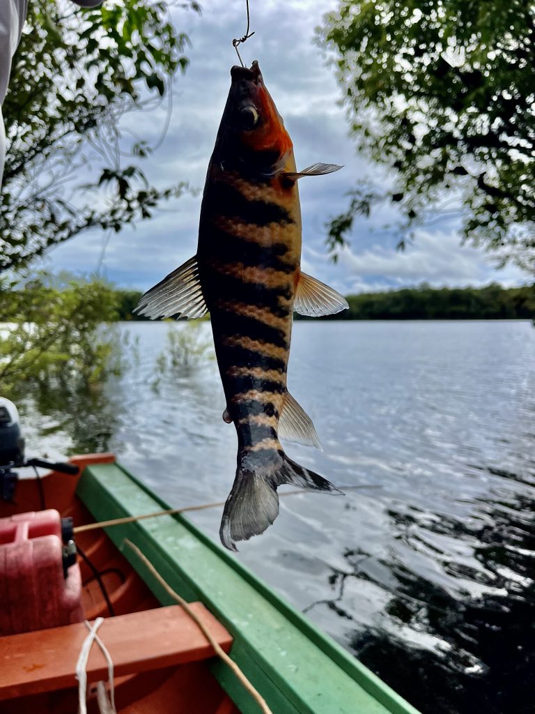 Klaus wird langsam zappelig, hat doch immer noch keiner bei ihm gebissen. Die meisten knabbern nur den Köder ab und verschwinden dann wieder. Da beißt bei mir etwas an. Ich ziehe mit Kraft die Angelschnur heraus und der Fang klatscht mir erstmal gegen den Kopf. 😝 Und? Es ist kein Piranha! Es ist ein größerer, gestreifter Fisch. Den Namen verstehe ich nicht (Agacu?), doch Nixon freut sich. Da ist mehr dran und lecker schmeckt der auch. Applaus 👏 .