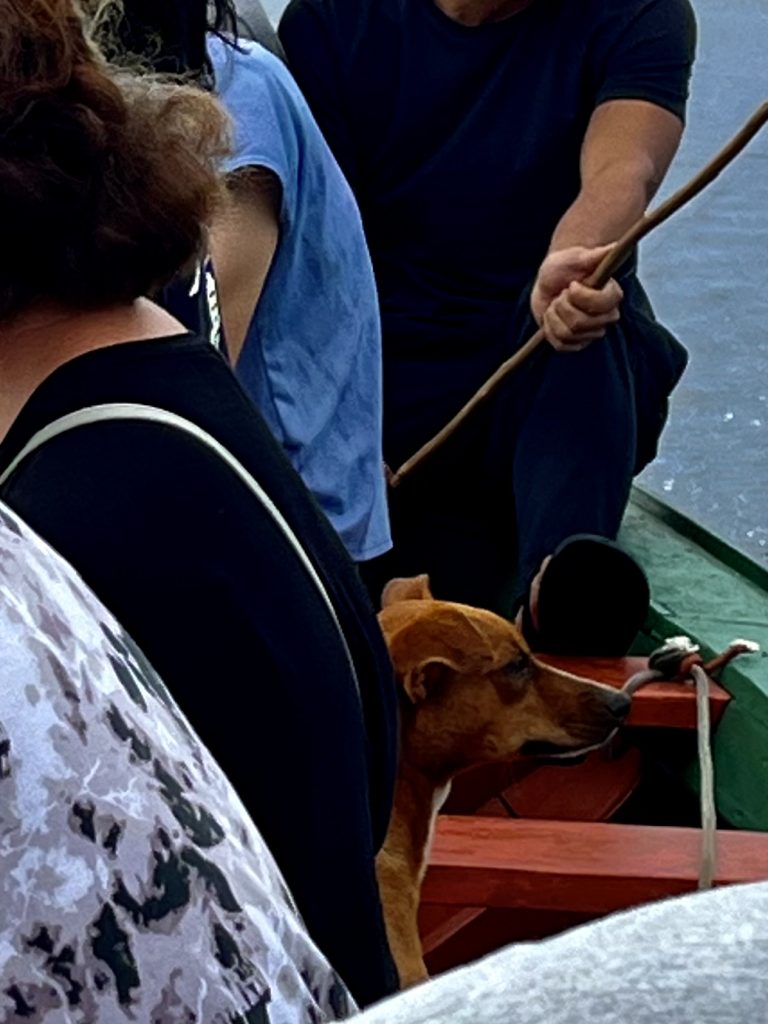 Und wieder heißt es, alle Angeln raus. Der weitere Erfolg hält sich in Grenzen. Dann kommt aber was ganz anderes angeschwomnen…., ein Hund. 😳 Ganz plötzlich ist er da, wie aus dem Nichts und will ins Boot. Germano, merke ich, ist das gar nicht recht, aber der Japaner hat ihn schon ins Boot gezogen. Der Hund freut sich und macht sich gleich über die Köderdosen her. Geschrei, Handgemenge, fehlt nur noch, dass wir alle umkippen. Nein, das passiert nicht, der Hund beruhigt sich und jault nur noch leise vor sich hin.