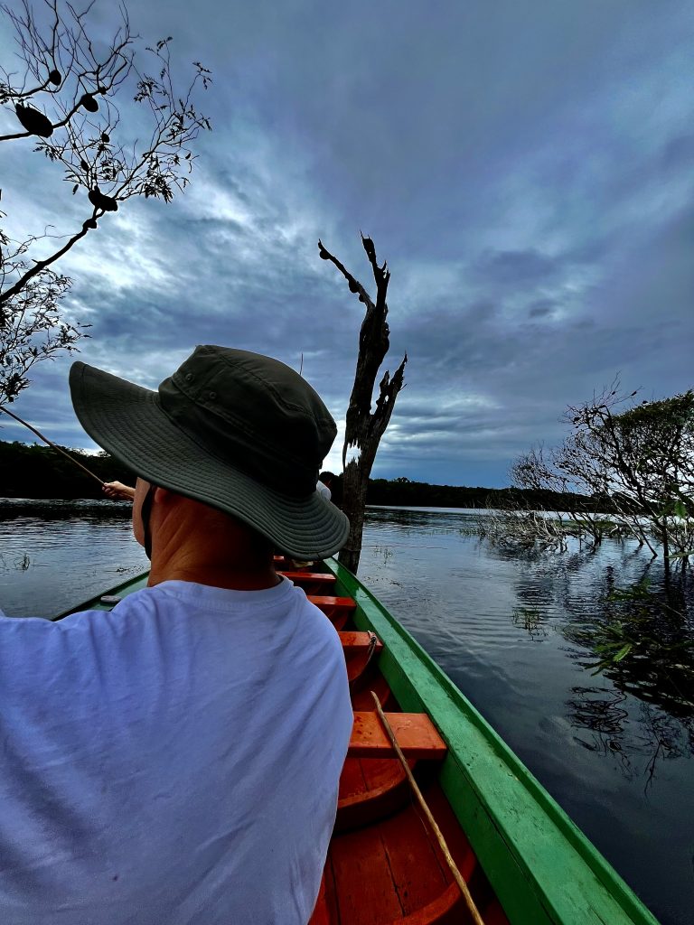 Gut 2 Stunden hat dieses Nassabenteuer gedauert. Aber nicht umsonst heißt der Regenwald, Regenwald! Wieder zu Hause heißt es raus aus den Klamotten, irgendwie aufhängen und über Stühle drapieren, und den Ventilator davor laufenlassen. Puhhh, ob wir die noch vor morgen Mittag trocken bekommen? Dann heißt es nämlich Schluß, Ende, Aus, es geht zurück nach Manaus. Da läutet auch schon die Mittagessensglocke, heute schon um 12:00 Uhr! Später geht’s zum Piranha-Angeln. Bei dem Wetter? Abwarten! Nach dem Essen, in der Hütte, hört der Ventilator plötzlich auf zu ventilieren. Stromausfall! Stromschwankungen hatten wir schon von Anbeginn, aber nun scheint es länger zu dauern…