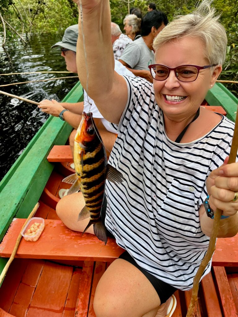 Eine der Japanerinnen ist die erste, die einen Piranha herauszieht. Großes Lobgeschrei von uns allen setzt ein. 👏