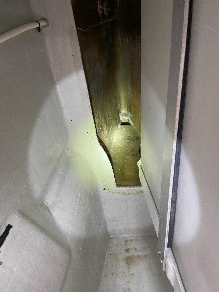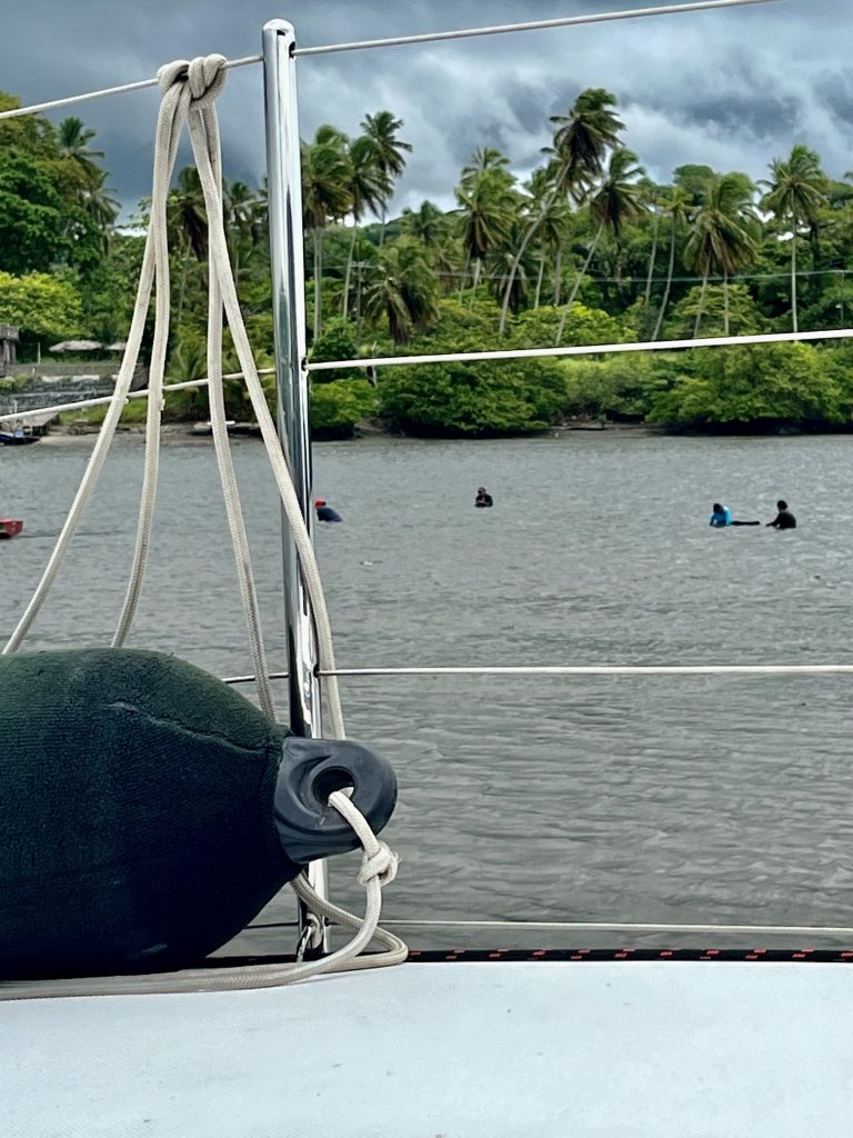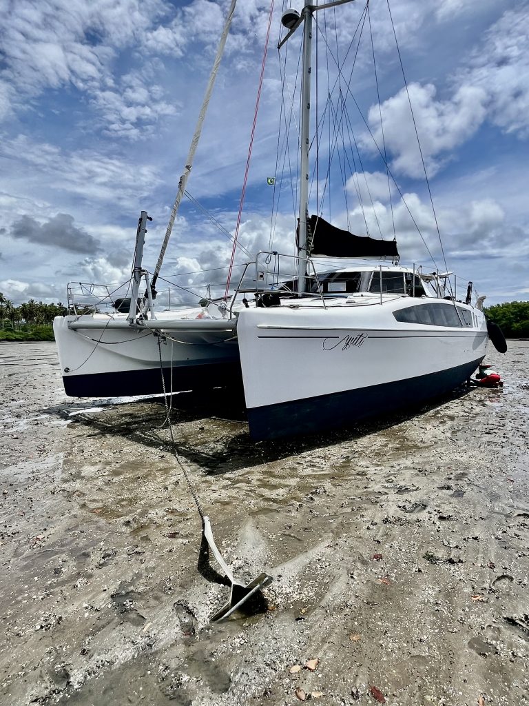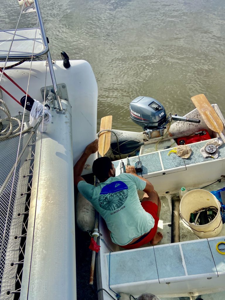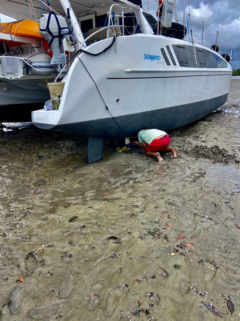 Klaus ist meistens mit dabei und will helfen, aber Ande ist da ganz eigen. Er will alles alleine machen! Aber unter diesen Bedingungen, ist perfektes Arbeiten eher unmöglich. Sagen wir es mal so, es läuft etwas hemdsärmelig ab. Trocknen, anschleifen, kleben, alles im Mud. Naja, die Yanmar Profis in Südafrika schafften es ja nicht mal unter perfekten Bedingungen. Ande hat nun fertig, verabschiedet sich und zuckelt mit Benzinkanister und Handwerkszeug unter den Armen durchs langsam steigende Wasser an Land. Wir müssen aber noch eine Nacht hier verbringen, da wir jetzt nicht mehr zur passenden Zeit die Marina erreichen können. Ande zeigt uns noch, wo wir nachher ankern sollen, denn hier würden später durch die Flut Steine durchs Flussbett rollen. 🫢 Okay. Die Flut kommt und kommt, das Wasser steigt und steigt, wir aber nicht. 😧 Wir stecken noch unverändert im Mud fest. Oh weia! Was würde passieren wenn wir stecken blieben? Das steigende Wasser käme wohl dann die Treppen rauf… Anderes Szenario, Yuti ploppt im letzten Moment hoch wie ein Korken??? 🍾 Klaus bekommt Schiss und ruft Christoph an, schildert ihm die Situation. Er, hmm, ja, ihr seid schwer, ihr habt Gewicht. Das letzte Mal war es eine Lagoon, die hatte da keine Probleme… Eine Lagoon hat viel breitere Rümpfe und viel mehr Auftrieb als wir. 🧐 Klaus meint, wir könnten 300 Liter Wasser ablassen, das Dinghy runter nehmen und den Dinghy-Motor, und wir könnten selber von Bord gehen, macht zusammen etwa 700 Kilo… 🤓. Nee, wir sollten mal noch warten, meint Christoph, nichts machen, auf gar keinen Fall den Motor anmachen – nee klar – er sei noch guter Hoffnung. Na dann hoffen wir mal. 🙏 🙏