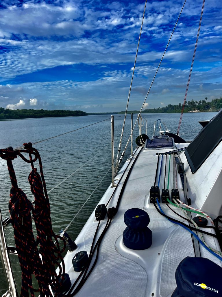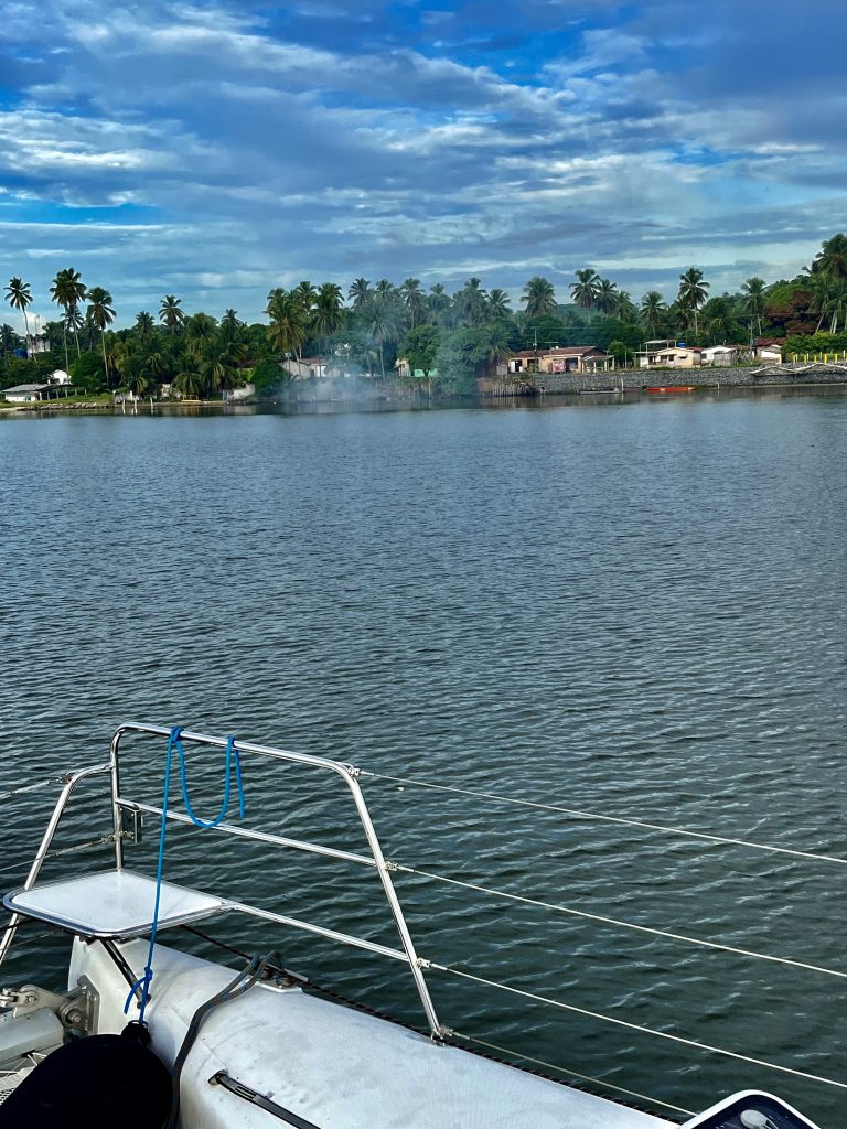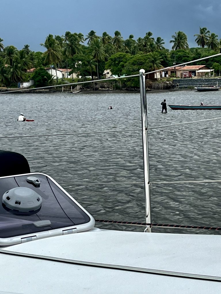 Nächster Morgen, 5:00 Uhr. Aufstehen, waschen, anziehen, um 6:00 Uhr kommt Anderson, Christophs brasilianischer Mitarbeiter, seine rechte Hand sozusagen. Wir müssen genau am Höhepunkt der Flut, den Paraibá do Norte River weiter hochschippern und 15 Minuten später vor Andes Dorf ankern. Die Sache mit der Tide ist nicht trivial! Der Tidenhub ist nicht immer gleich. Der größte Unterschied, der hier im Fluss auftreten kann, sind 2,70 Meter. Jetzt aktuell haben wir noch 2 Meter Unterschied, und mit jedem Tag wird’s weniger. Die Möglichkeit durch Beachen das Boot soweit aus dem Wasser zu bekommen, dass unsere Arbeiten durchgeführt werden können, ist nur heute und morgen noch möglich. Dann müssten wir wieder Wochen warten, bis der Rhythmus des Mondes es erneut erlauben würde. Ande führt uns gut um alle Untiefen herum, wir schmeißen den Anker und müssen nun warten. Warten, dass das Wasser sinkt. Unser Mann tuckert derweil zu seinem Dorf, um zu frühstücken. In 1 1/2 Stunden wird er wieder zurück sein. Okay 👍.