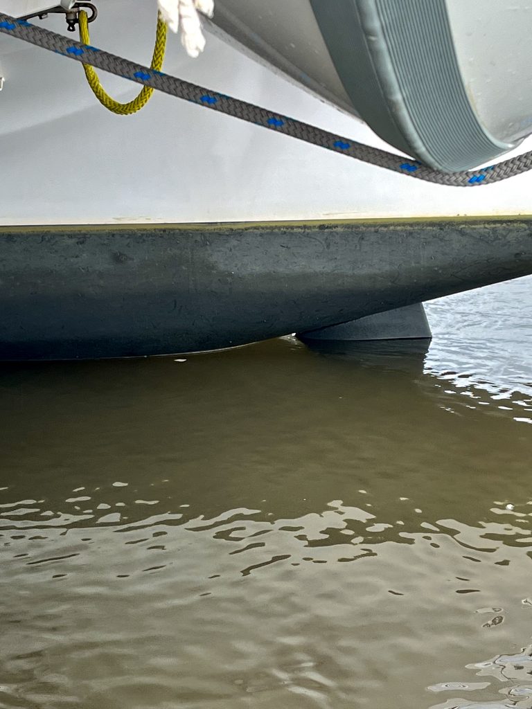 Da hocken wir nun im Schlick. Anders als geplant sinkt Yuti mit ihren Minikielen sehr weit ein. Zu weit? Sogar Ruderblätter und Propeller sind im Mud.