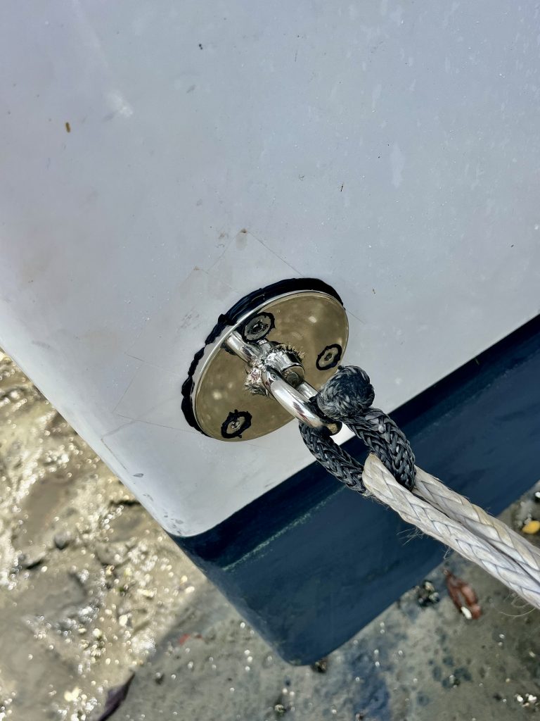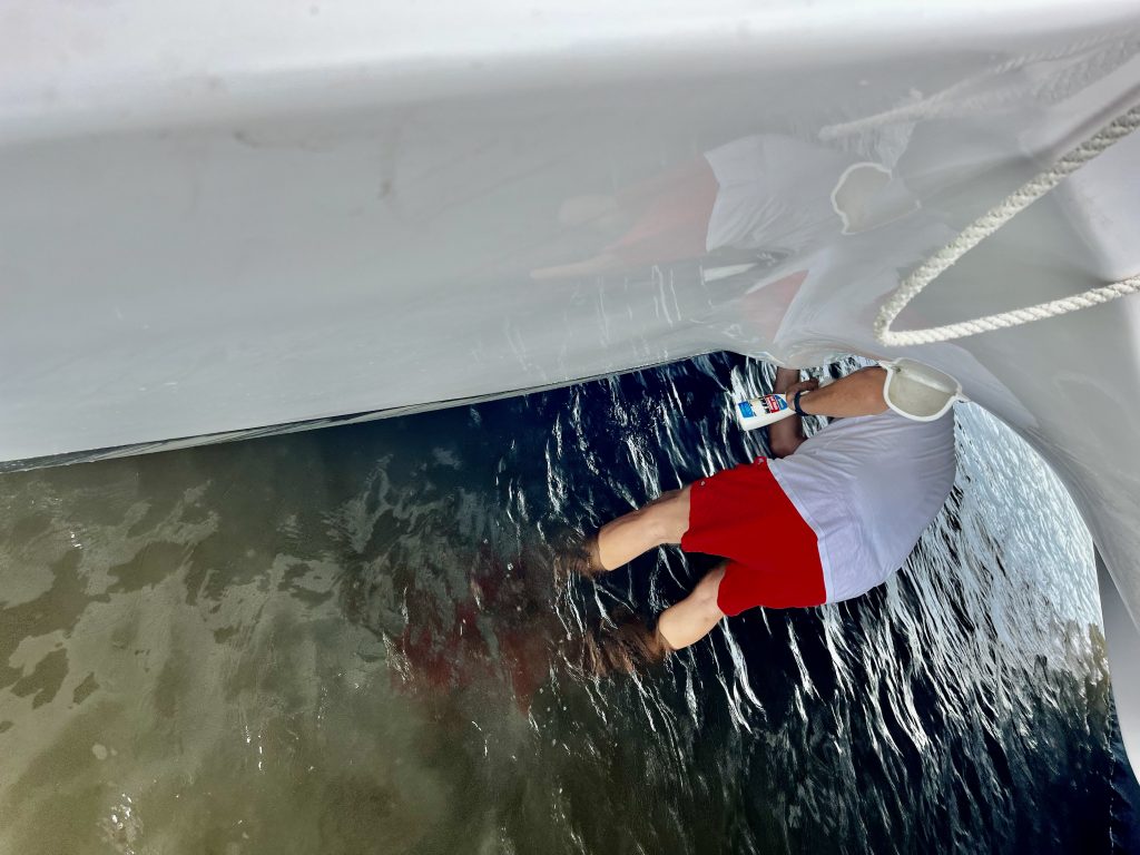 Nun sind sie mit 4 Schrauben, statt nur mit 2 Haltepunkten versehen. Blöd ist nur, dass wir uns null Komma null mit Ande verständigen können. Er kann kein Wort Englisch und wir kein Wort Portugiesisch. Das trifft sich “gut”, denn vor allem Klaus leidet, dass er nichts anmerken oder gar fragen kann. 🤐 Um uns zu beschäftigen und abzulenken, fangen wir an das Boot zu putzen. Selten kommen wir so easy ans Unterwasserschiff heran wie jetzt.