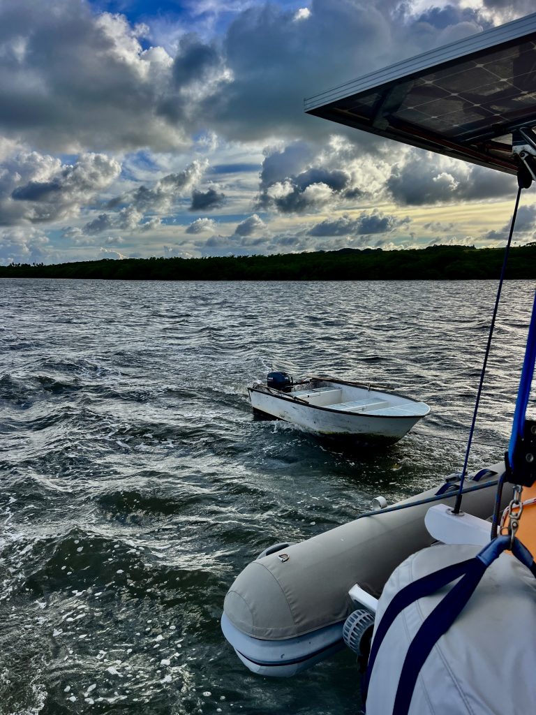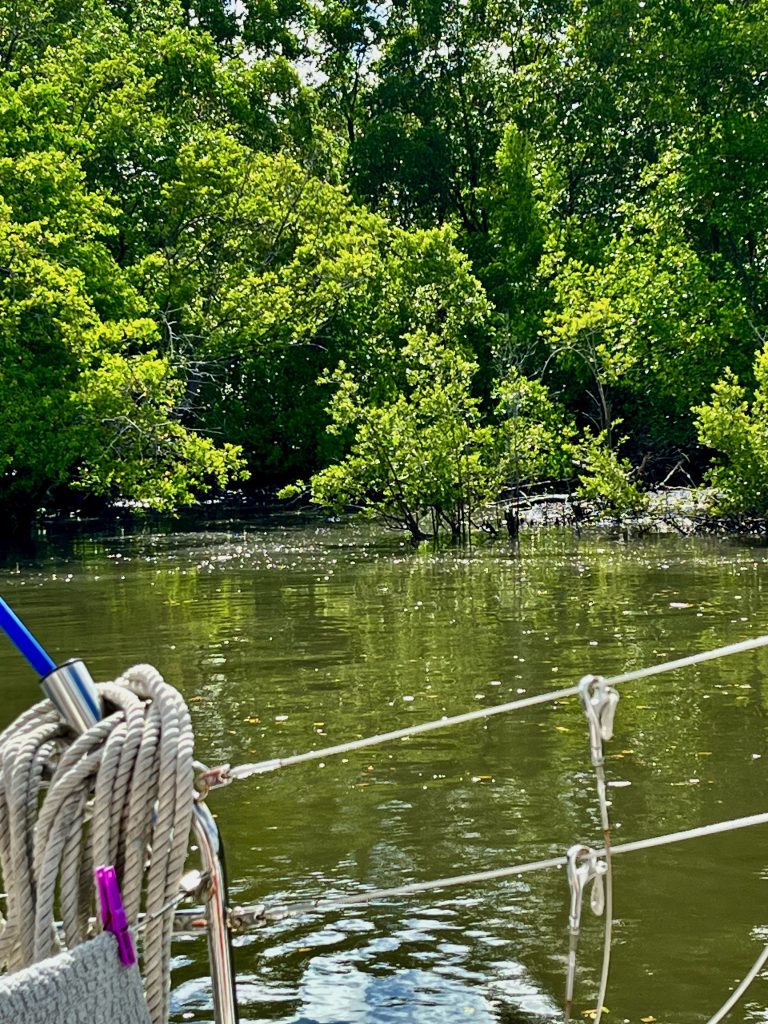 Tatsächlich, … nur kurze Zeit später ist Yuti frei und dreht sich etwas im Flusswasser. Sie ist nicht hochgeploppt, sondern sanft dem Schlamm entstiegen. Da gibt es ein ungutes Rumpelratsch. Über irgendwas ist Yuti drübergerutscht. Hörte sich nicht gut an. Klaus meint, das könnte einer der Haufen gewesen sein, die er vorhin um die Saildrives ausgeschaufelt hatte. Hmm… Wir können ja morgenfrüh beim Tidenwechsel nachschauen, wenn dann das Wasser etwas klarer ist. Jetzt müssen wir weiter am Ufer des Flusses einen geeigneten Ankerplatz finden. Das gestaltet sich schwierig. Der Anker will nicht greifen. Dann doch, aber wir müssen im Verlaufe der Nacht noch 3 mal neu ankern. Bei jedem Gezeitenwechsel reißt es den Anker wieder raus.