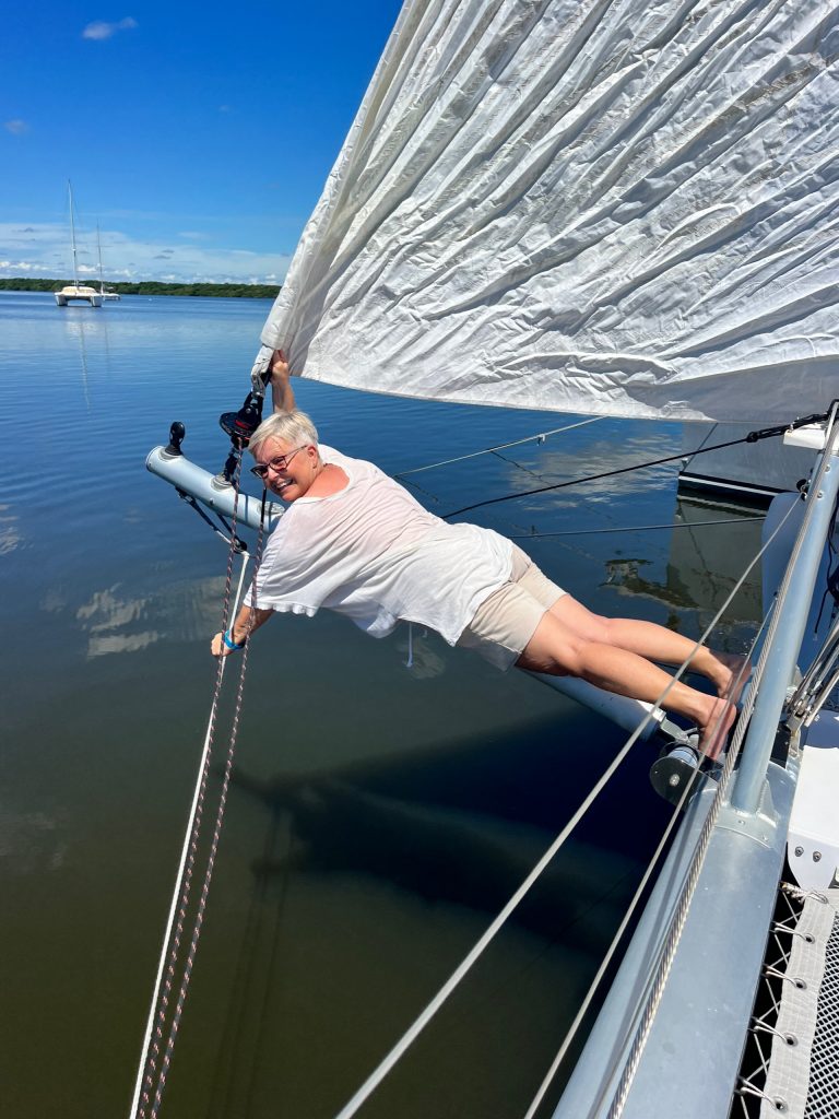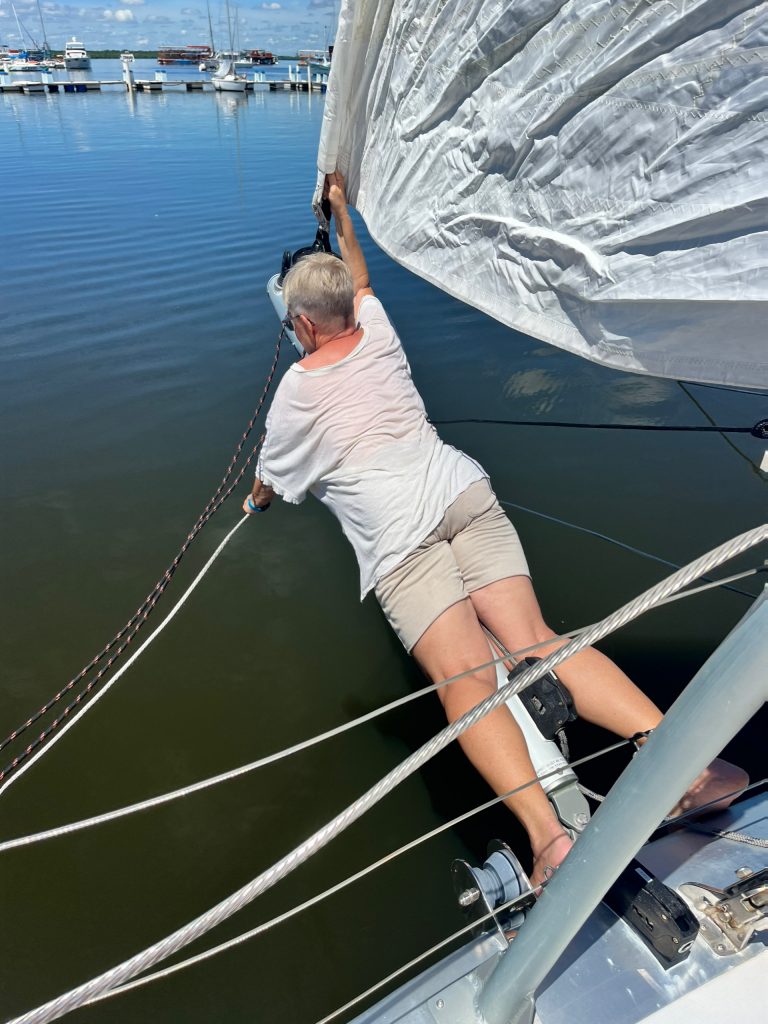Das Installieren des Screechers wird dagegen zu einer Herausforderung. Es ist jedesmal ein Problem, die Leine, die das Segel am Mast hochzieht, unverdreht zu halten. Zudem ist es unglaublich heiß und windstill. Wir müssen 2 Mal unterbrechen, Wasser trinken und uns ausruhen, um nicht einfach umzufallen. 🥵🥵 Irgendwann ist es geschafft. Nur vorne am Furler gibt es noch eine Stelle, wo schon seit längerem ein Stück Klebeband fehlt, um das Segel vor Verletzungen zu schützen. Das soll nun auch noch erneuert werden. Aber wie da rankommen? Klaus ist der Meinung, das sei jetzt mein Job. Ups, okay, dann muss ich jetzt auf den Bugspriet klettern. Hoffentlich bricht der nicht! Was kann schon schlimmstenfalls passieren, meint mein Mann? Ich könnte ins Wasser fallen… Dann sollte ich jedoch meine Brille festhalten… 🤓. Na dann mal los.