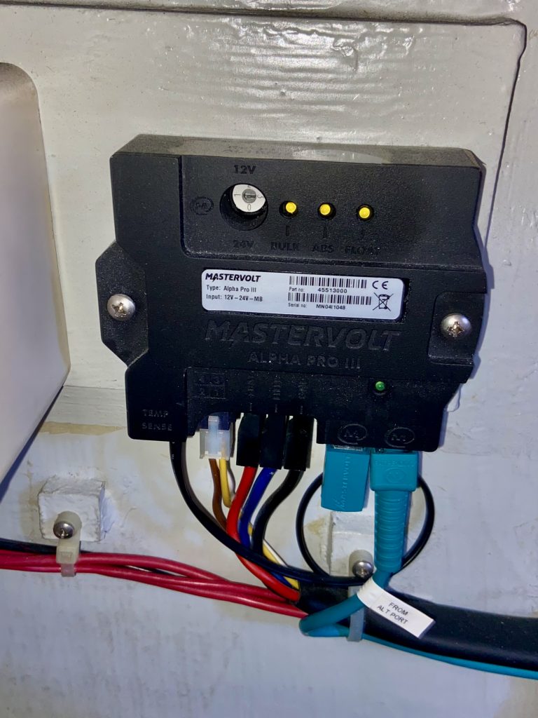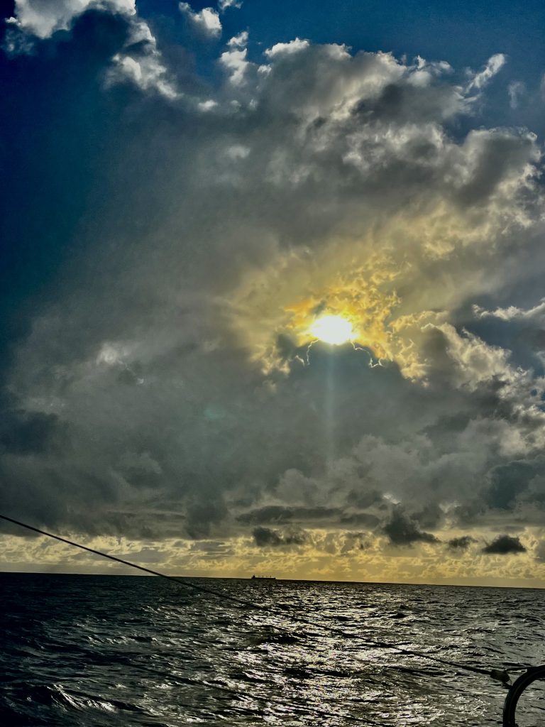 Klaus verschwindet in der Luke und schaut sich das Steuerungsrelais für die MasterVolt Lichtmaschine an, ein grünes Licht flackert, die gelben Ladelichter sind aus. Hmm… Er überprüft alle Steckverbindungen und tauscht alle Sicherungen aus. Zum Dank verabschiedet sich das MasterVolt System nun ganz. Das grüne Licht flackert nicht mehr und auch im System ist das rechte Lademodul nicht mehr vorhanden. Na klasse! 😡 Wie war das noch? Auf jeder Überfahrt gehen Dinge kaputt? Verflixt nochmal! 😠 Jetzt haben wir nur noch das System auf der linken Seite, um Strom zu produzieren. Das benötigen wir aber auch dringend, denn bei Bewölkung und bei Nacht läuft da nicht viel bis gar nichts über die Solarpanels. Und unser Stromverbrauch an Bord ist hoch. Autopilot, Bordcomputer, Starlink, Kühlschrank, Gefrierbox, Schiffsbeleuchtung, Radar, Handys,….. Ich denke wir sollten unser portables Klapppanel rausholen und Starlink über diese Zusatzbatterie laufen lassen. Bei der Bewölkung bringt das nicht viel, meint Klaus. Wir holen es aber trotzdem raus und installieren schon mal alles, sollte die Sonne doch noch scheinen.
