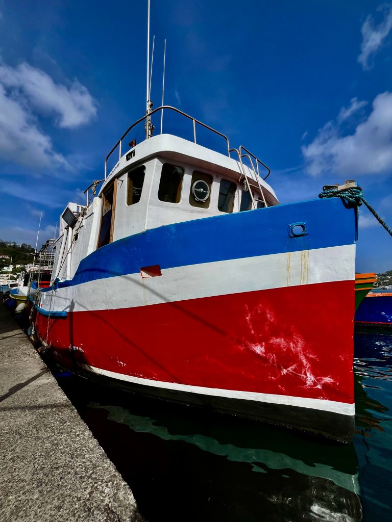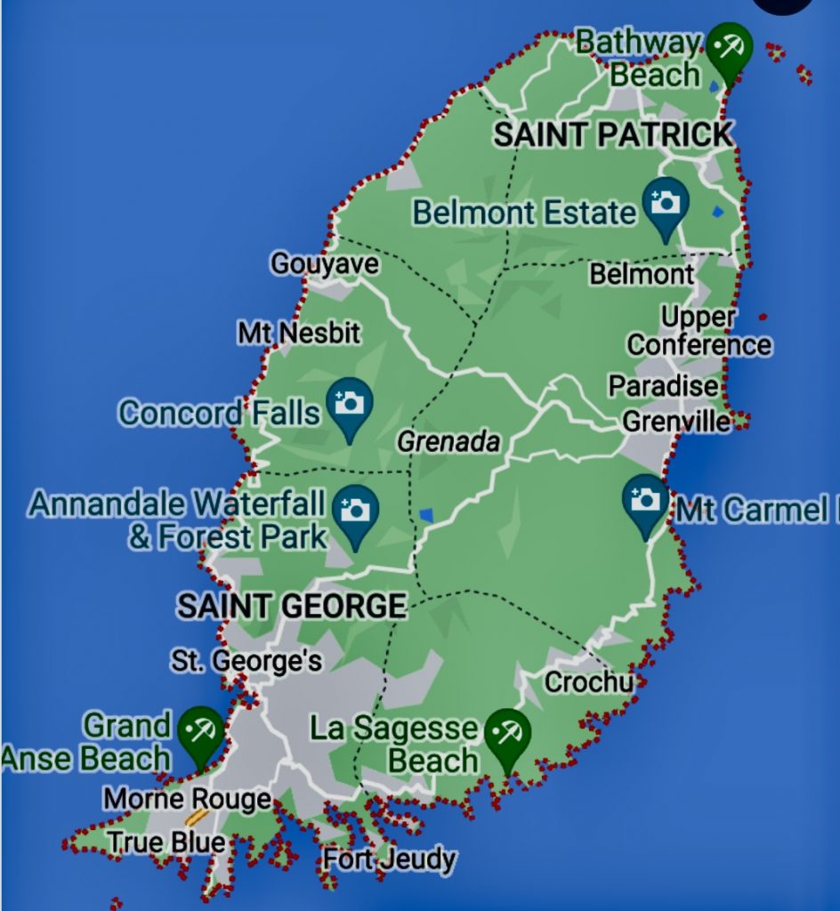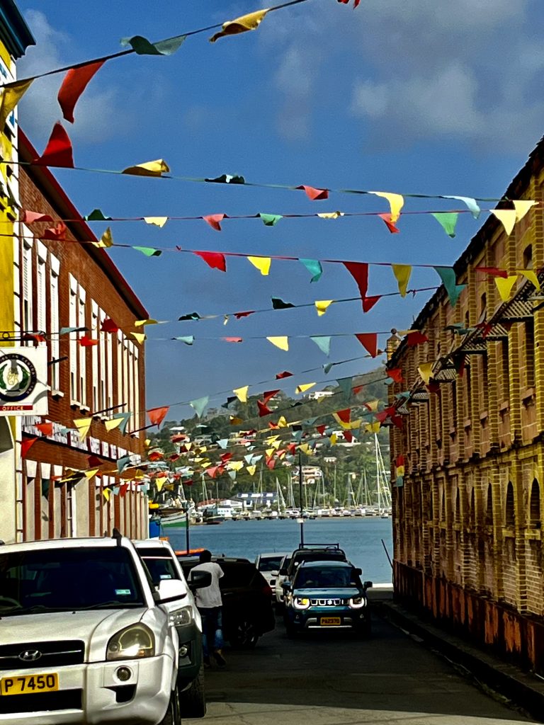 1762 eroberten die Briten die Insel zurück, dann wieder die Franzosen und darauf wieder die Engländer, die sie dann 1974 in die Unabhängigkeit entließen. Grenada blieb aber Mitglied des Commonwealth und König Charles ist somit ihr Oberhaupt. Die Amtssprache ist Englisch, daneben gibt es noch die Grenada-Kreolsprache, die mit afrikanischen Begriffen gemixt, sich aber stark am Englischen orientiert. Die Sklaverei wurde 1834 abgeschafft, mit ihr auch die Zuckerrohrplantagen. Umgestellt wurde auf Muskatnussanbau und Kakao. Viele dieser kostbaren Muskatnussbäume und auch alles andere wurde durch den Hurrikan Ivan 2004 gründlich zerstört. Daran tragen die Einwohner noch heute schwer. 15 Jahre brauchen Gewürzpflanzen um wieder zu tragen. Der Tourismus konnte schneller wieder aktiviert werden. Übrigens, freie Wahlen gibt es hier auf der Insel erst seit 1984. So, das reicht jetzt zur allgemeinen Einordnung. Ach nee, die Flagge will ich noch erklären.