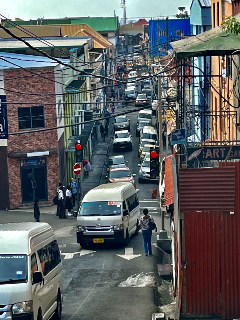 Und wir warten auf den „Bus“. Das sind Minitransporter mit bis zu 15 Plätzen, oft ziemlich ramponiert aber noch fahrtüchtig. Sie fahren ständig hin und her, die Orientierung ist nicht leicht, aber man kann den jeweils mitfahrenden „Kassierer“ fragen. 5,- karibische Dollar zahle ich für uns beide. Da kann man nichts gegen sagen. Und ab geht die wilde und hupende Fahrt… 🤭.