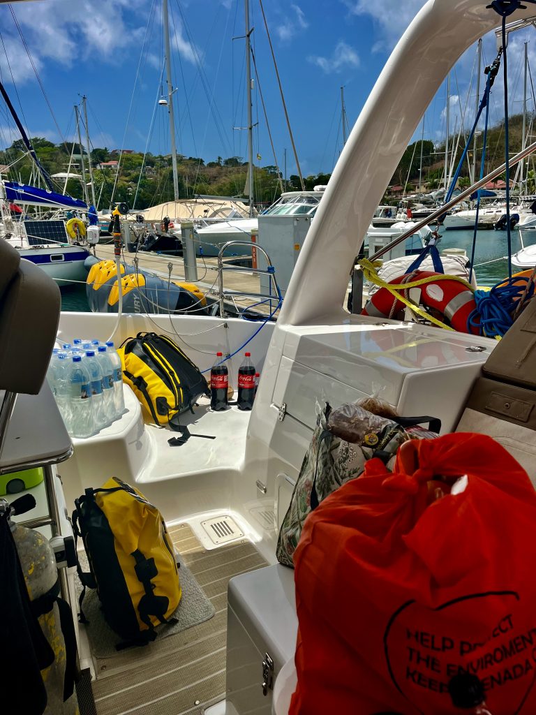 Erschöpft muss nun alles wieder verstaut werden. Jetzt aber bloß nicht schlapp machen, der Bootswaschgang wartet noch! Geschafft! Dann klariert Klaus aus und bezahlt die Marina. Zack sind wir vom Strom und Wasser abgeschaltet. Okay, dann halt wieder Selbstversorgung. Da kommt Rebecca vorbei und verbringt den Rest des Tages mit uns zusammen. Uns geht der Stoff des Erzählens nicht aus. Am Abend gehen wir zusammen etwas Essen und hauen unsere letzten Dollar auf den Kopf. 400,- Dollar haben wir uns aber beiseite gelegt, um morgen noch zu tanken. Wieder am Boot, bekommt Rebecca noch eine Stiege Stugeron gegen Seekrankheit, da sie noch 2 Überfahrten vor sich hat. Hoffentlich findet sie noch die passende Mitfahrgelegenheit, um die Fähre in Trinidad nach Venezuela zu erreichen, denn diese fährt nur zweimal im Monat. Eigentlich wollte sich Martin für sie umhören, aber bis jetzt hat sie nichts von ihm gehört. Tja, das Obst hat er dann auch nicht mehr vorbeigebracht. Eben spricht uns ein amerikanisches Ehepaar auf unser Boot hin an. Sie wollen sich eventuell auch eine Seawind 1260 zulegen. Na sowas, da machen wir doch glatt noch eine Bootsführung für sie. Die Freude ist groß, auf beiden Seiten. Dann verabschieden sie sich und auch Rebecca geht von Bord. Wir sollen ja noch einmal richtig ausschlafen. Morgen früh kommt sie nochmal zum Winken 👋.