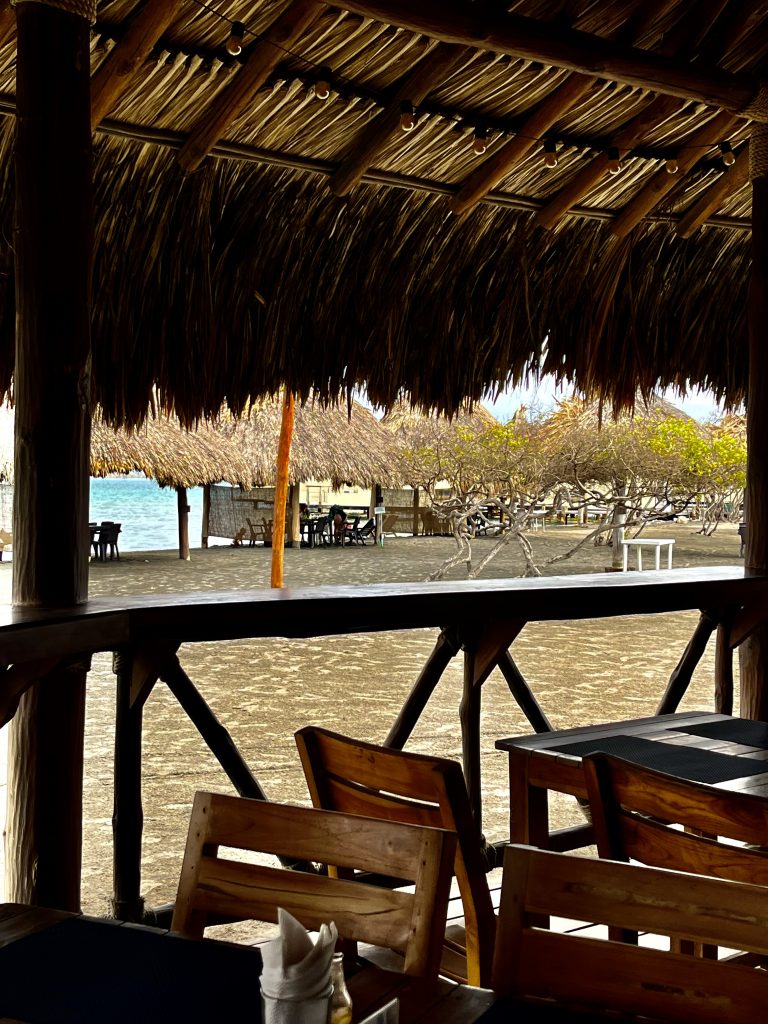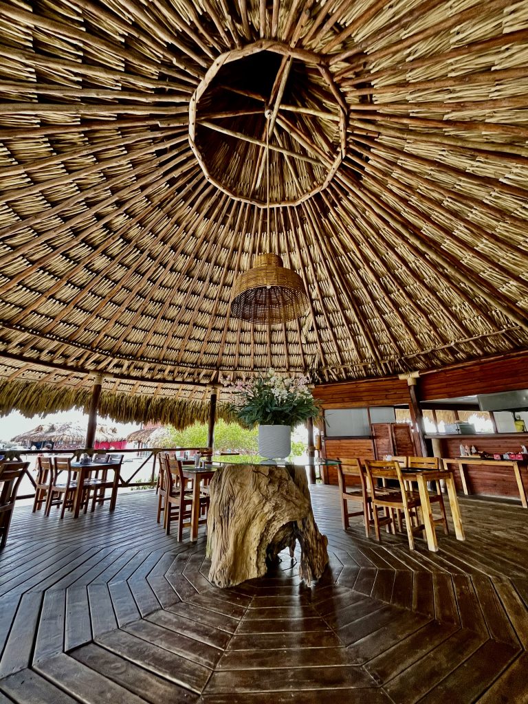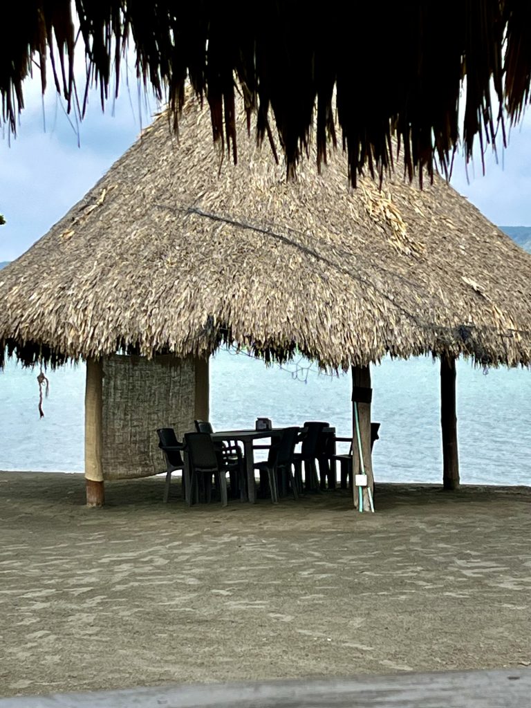Unter die Strandhütten könnten wir uns auch setzen. Diese Bauweise zieht sich übrigens die ganze Bucht entlang.