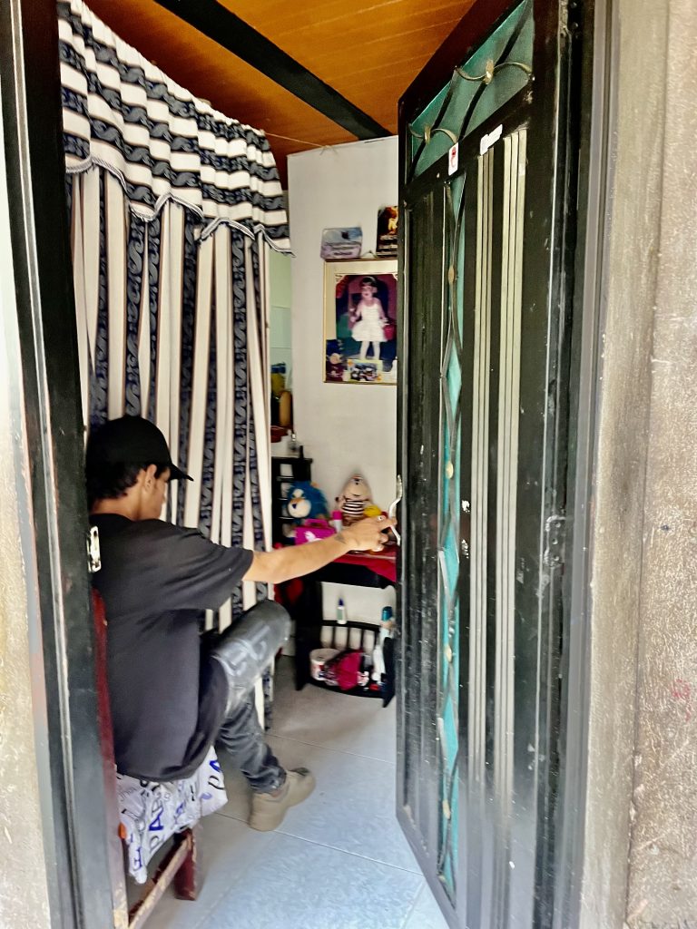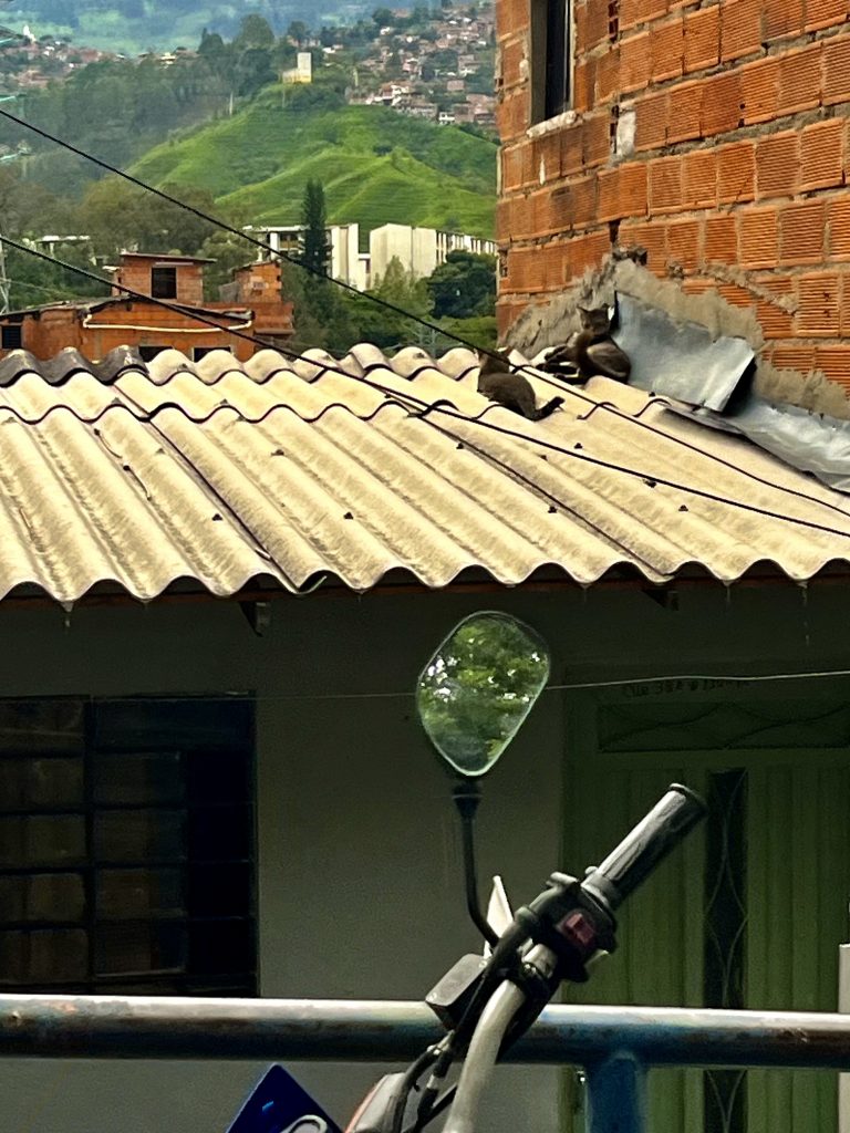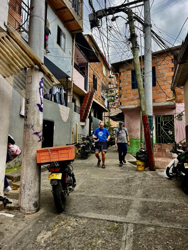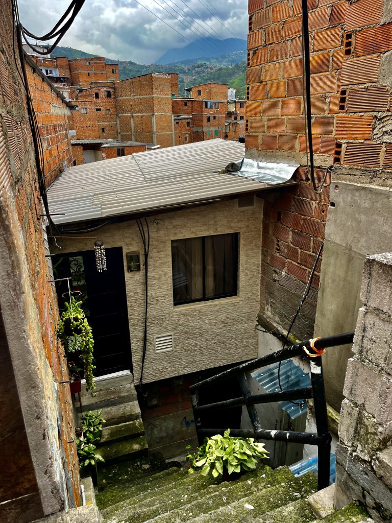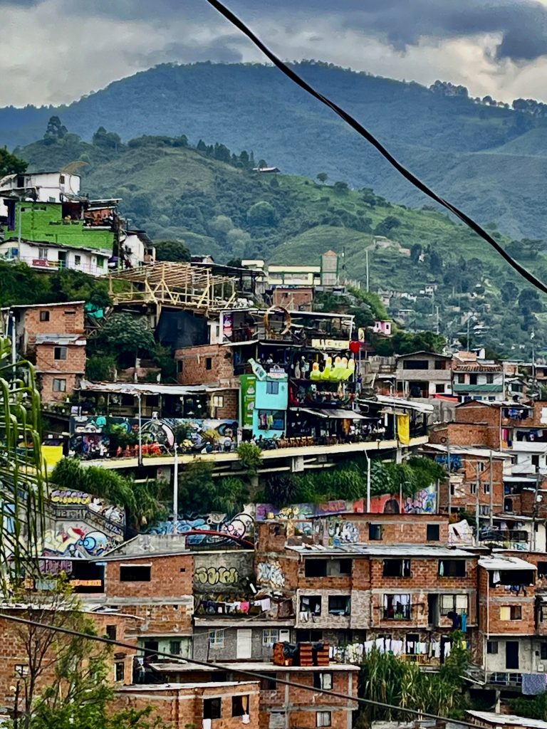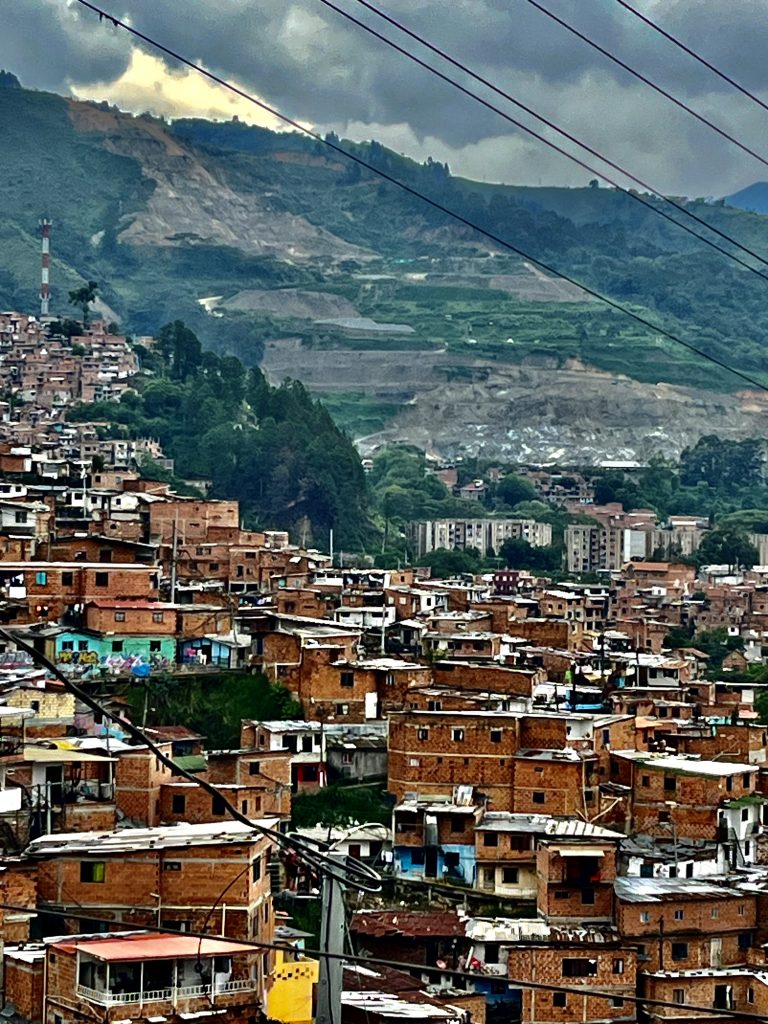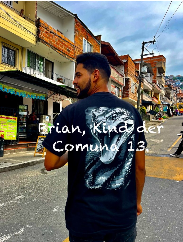 Brian lässt uns hineinschauen in sein junges Leben. Er ist aufgeregt und voller Tatendrang. Das hier war Kriegsgebiet, sagt er. Hier kämpften alle gegen alle, um Menschen, um Land und um Macht und um die San Juan Avenue. Sie war der Zugang zur karibischen Küste, der ideale Schmugglerweg für Drogen, Waffen, Geld. Wer sie und damit die Comuna kontrollierte, kontrollierte den Drogenhandel. In den 80er und 90er Jahren, bekämpften sich die FARC, eine revolutionäre Streitkraft / die Guerilla, eine marxistisch, linksextreme Gruppe / das Militär des Staates und mit diesem (aber auch nicht immer) das Paramilitär, rechtsextrem ausgerichtet. Ein heilloses Durcheinander. Nicht zu vergessen, Pablo Escobar! Er mischte natürlich kräftig mit um die Hoheit dieses Gebietes. Zusätzlich spielten noch weitere Gruppierungen eine Rolle. Mir schwirrt der Kopf, ich lass es mal soweit gut sein. Mit 10 Jahren wird Brian Bandenmitglied. Bei welcher Bande, sagt er nicht. Da ist sein Vater schon längst tot. Der Leichnam wird nie gefunden. Vermutlich ist auch er auf der gegenüberliegenden, gut zu sehenden Bauschuttdeponie verscharrt worden, wie so viele.