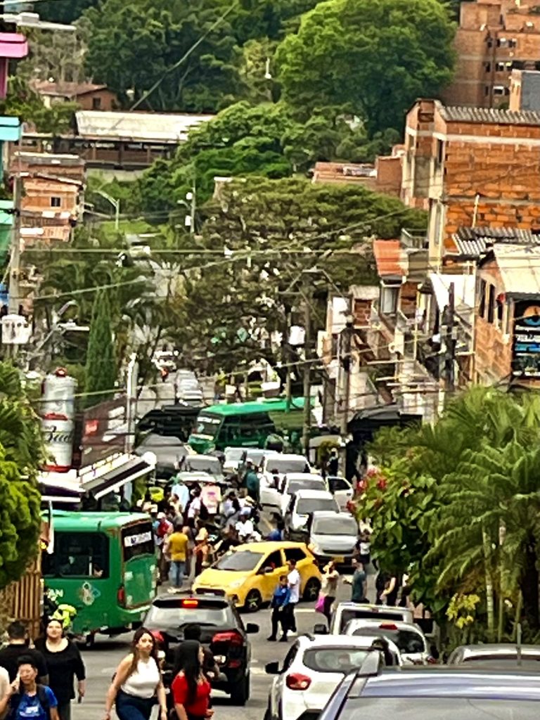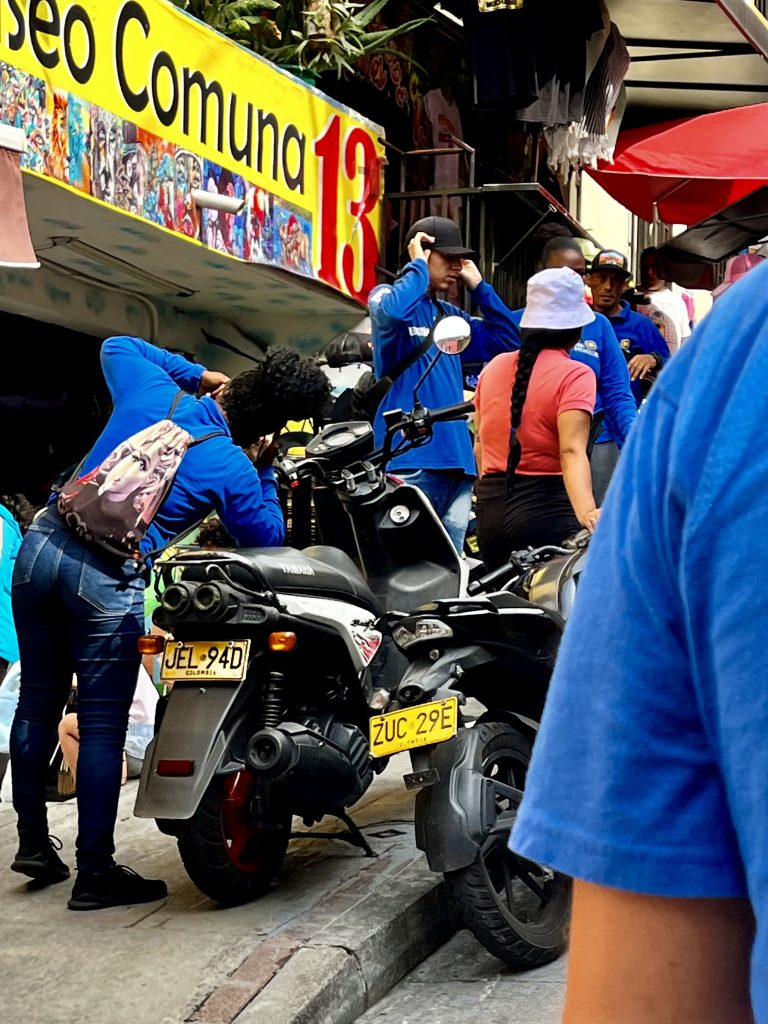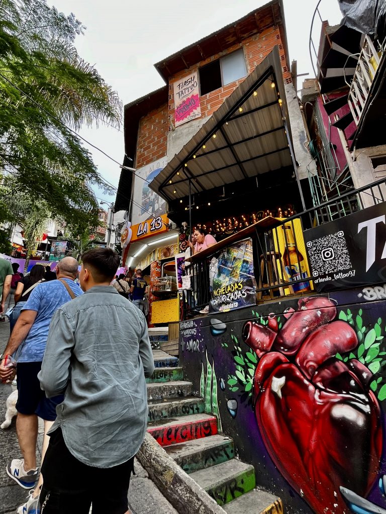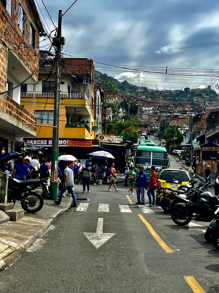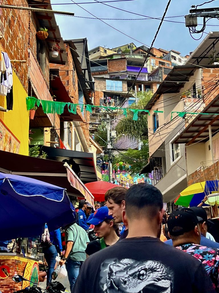 Wir sind oben angekommen, mit der Gondel. 🚠 Schon hier, am Beginn der Comuna 13, empfängt uns ein Gewusel von Menschen UND Brian, 27 Jahre alt und einer, der das Grauen noch voll mitbekommen hat.