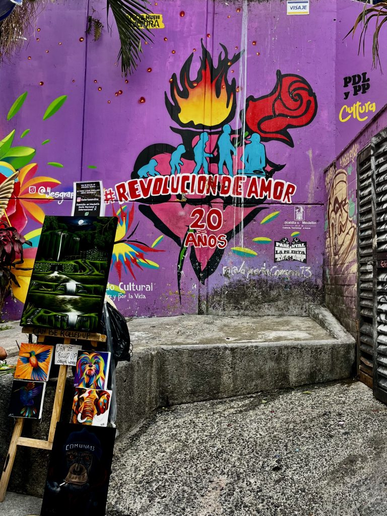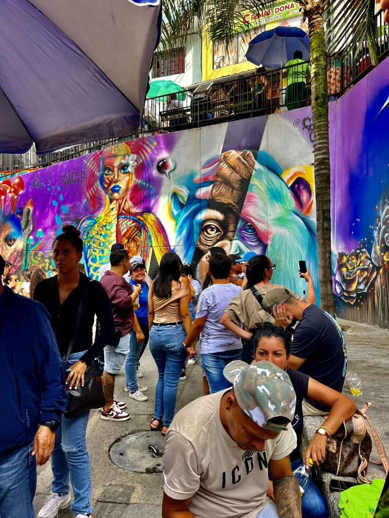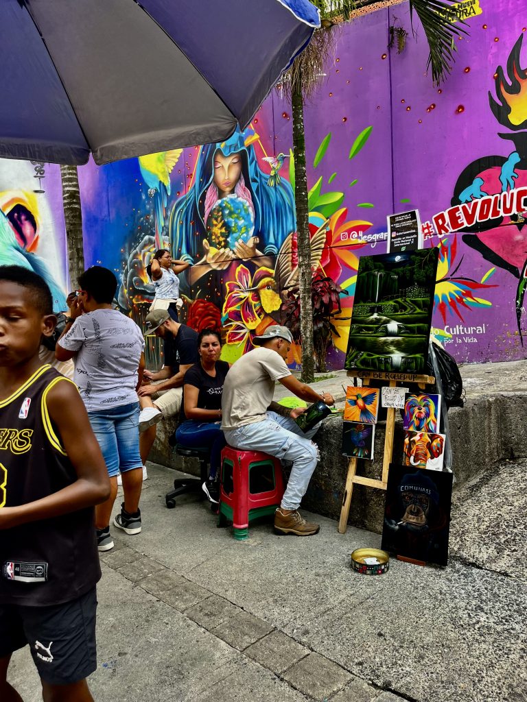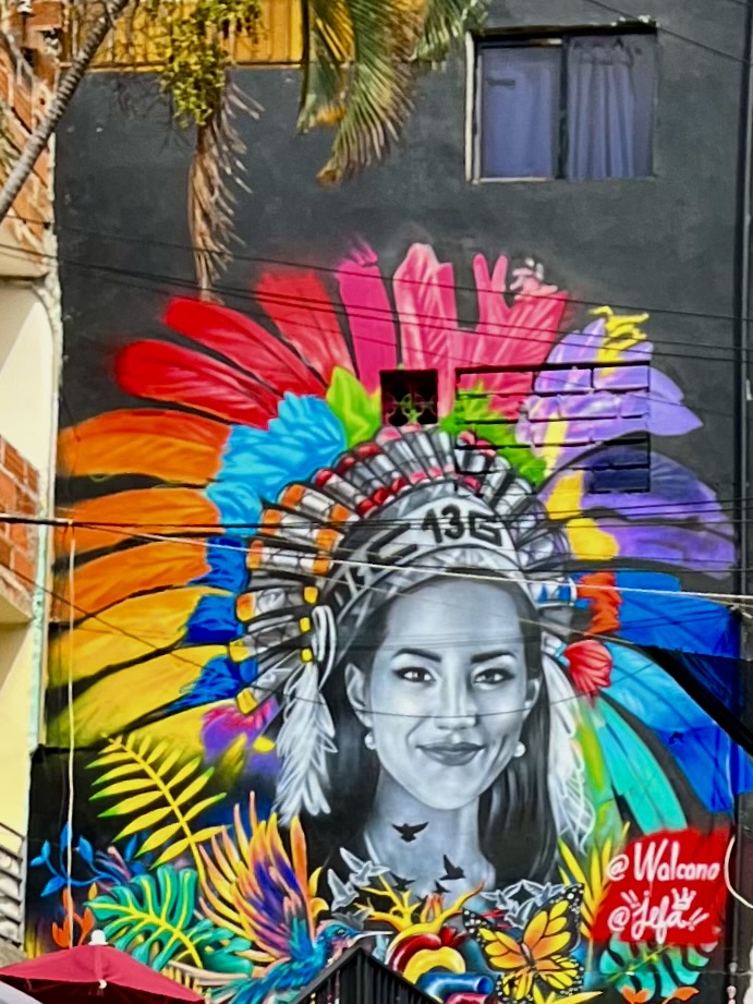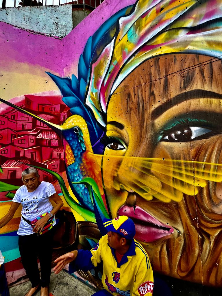 Die meisten Bildnisse stammen von Künstlern dieses Stadtteils, aber auch Auftragskünstler durften sich hier verewigen. Mittlerweile ist die Comuna 13 eine einzige, beeindruckende Kunstgalerie. Die Bilder explodieren förmlich vor Buntheit und Lebendigkeit. Fast jedes Bild hat etwas von der Vergangenheit zu verarbeiten und gleichzeitig für die Zukunft etwas zu sagen. Das Bild oben, vor dem wir knien, nimmt Bezug auf Mutter Erde, die es gilt in Händen zu halten und zu bewahren. Ich muss sofort an den Auftrag der Kogi denken. 🥹