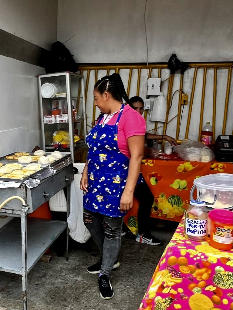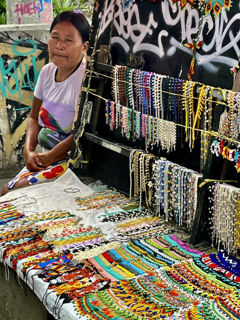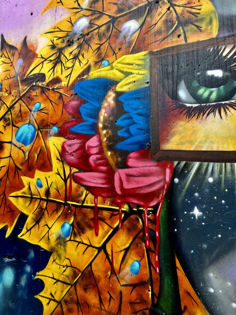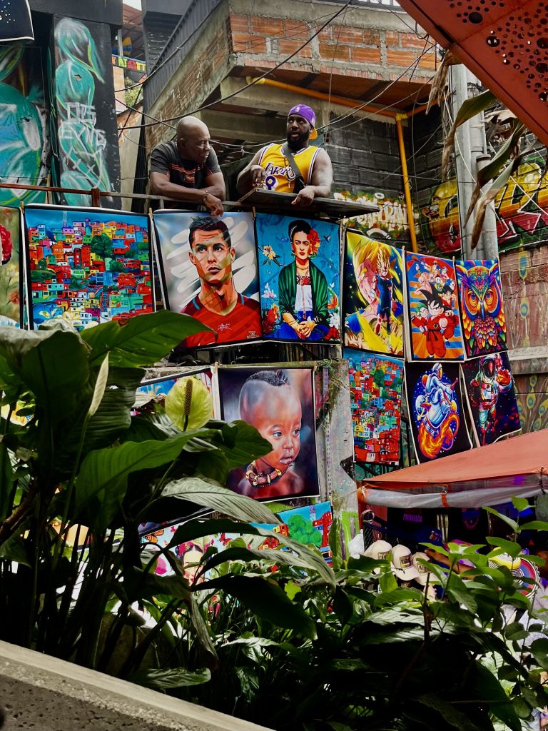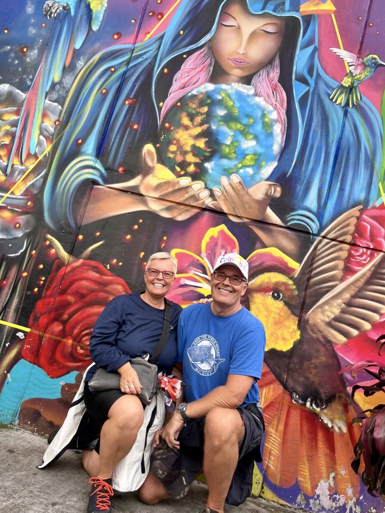 Die meisten Bildnisse stammen von Künstlern dieses Stadtteils, aber auch Auftragskünstler durften sich hier verewigen. Mittlerweile ist die Comuna 13 eine einzige, beeindruckende Kunstgalerie. Die Bilder explodieren förmlich vor Buntheit und Lebendigkeit. Fast jedes Bild hat etwas von der Vergangenheit zu verarbeiten und gleichzeitig für die Zukunft etwas zu sagen. Das Bild oben, vor dem wir knien, nimmt Bezug auf Mutter Erde, die es gilt in Händen zu halten und zu bewahren. Ich muss sofort an den Auftrag der Kogi denken. 🥹