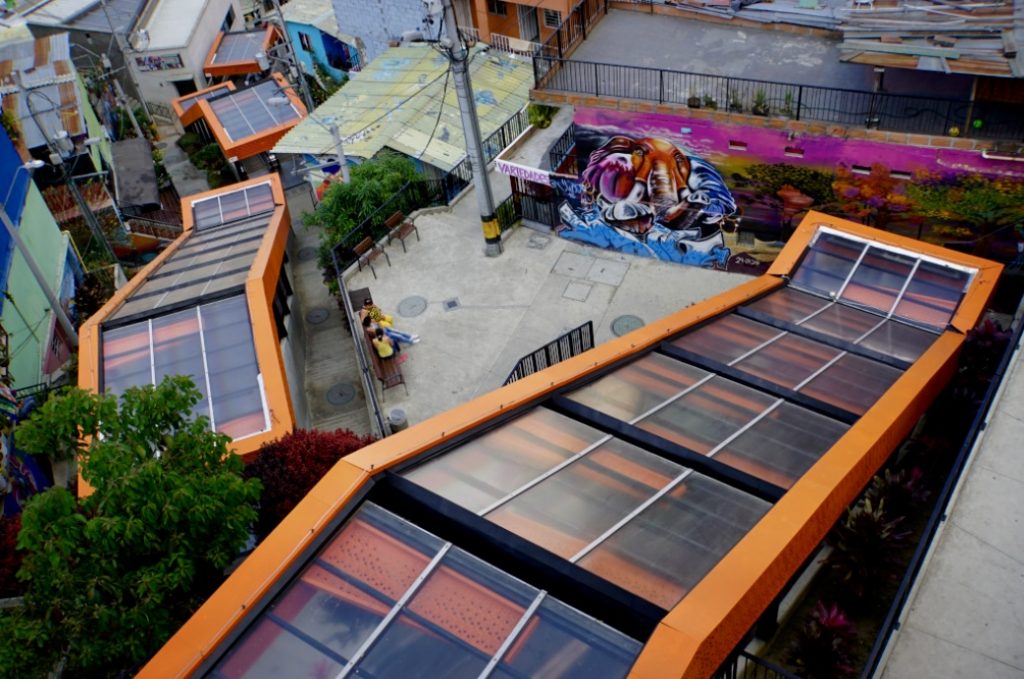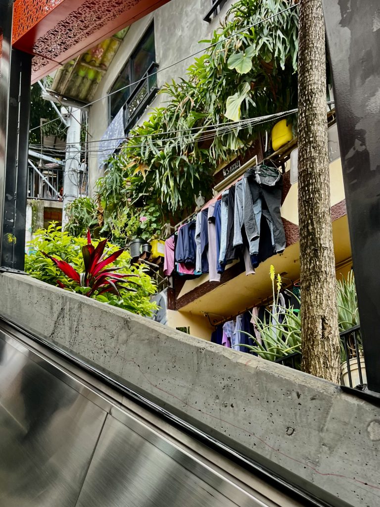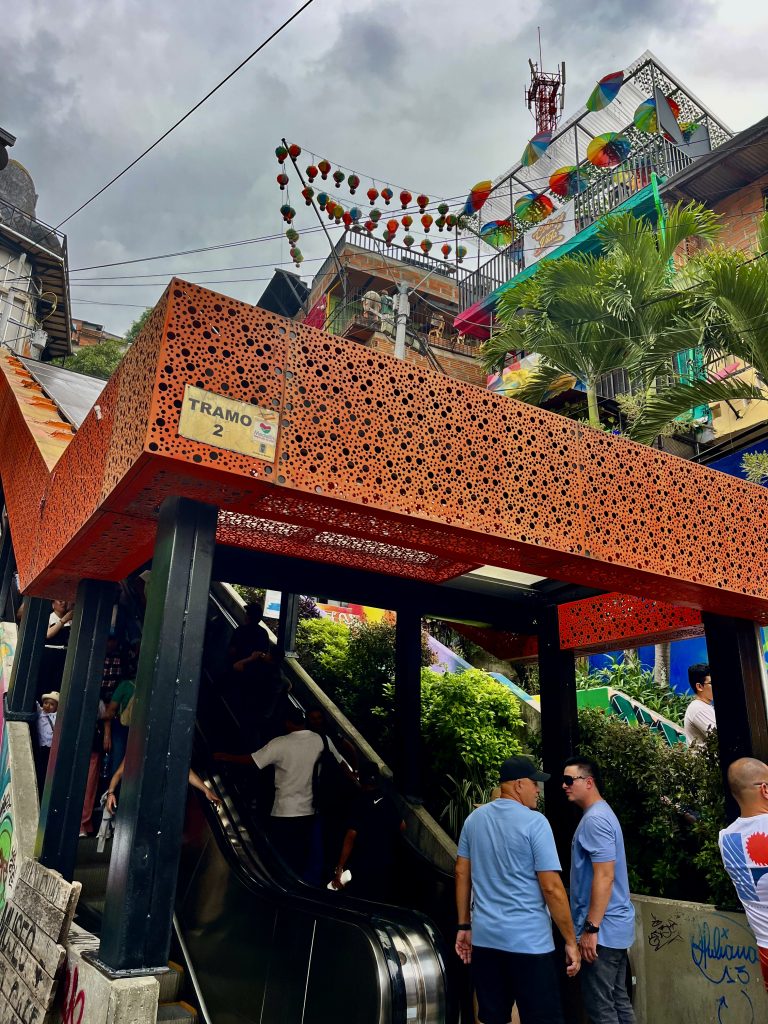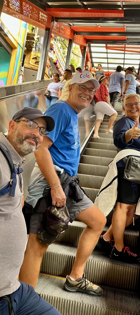 Brian erzählt, ab 2007 erholt sich das Viertel langsam. Überall zieren plötzlich Graffiti die Wände der Häuser. Mit Kunst, Hip Hop, Breakdance, Sport und Rapp versucht die Jugend das schreckliche Trauma zu verarbeiten. Und das ist Brian ganz wichtig!, die Jugend beschließt andere Wege zu gehen als noch ihre Eltern sie gingen. Und die Jugend gewinnt, sagt er mit leuchtenden Augen. Sie lernen, dass es andere Wege gibt als Gewalt. Das ganze Land ist müde vom fast 50- jährigen Bürger- und Bandenkrieg. Dann kommt das irre Rolltreppenprojekt. 2010 ist Planungsbeginn. Das ganze muss gut und mit viel Fingerspitzengefühl vorbereitet werden. Sozialarbeitern wird schnell klar, dass es für viele Menschen fast unmöglich ist die steilen Hänge zu ihren Behausungen zu erklimmen. Insbesondere für Alte, Schwangere und Erkrankte ist es schier unmöglich. Aber erstmal muss das riesengroße Müllproblem und die Versorgung mit Wasser und Strom bewältigt werden. Die Regierung und die Stadt tun Buße an dem so lange vernachlässigten Gebiet. Dann muss den Bewohnern erst einmal erklärt werden, was eine elektrische Rolltreppe überhaupt ist. Für den Bau sollen 30 Häuser weichen, passender Ersatz geschaffen werden und dann geht’s los, im Februar 2011. Wenn man jetzt glaubt, die Bandenproblematik sei vollkommen gelöst, irrt man gewaltig. Denen gefällt das Rolltreppenprojekt so gar nicht! Verlieren sie doch dadurch die Herrschaft über ihr Viertel. Während der Bauarbeiten kommt es immer wieder zu Schießereien. Die Vorarbeiter rufen aufgeregt die Bauleitung an und berichten davon. Man beschließt Warnsirenen zu installieren und gibt die Devise aus, bei Alarm so schnell wie möglich nach Hause zu laufen. Das Projekt gelingt, es geht um Mobilität und um Stolz auf das Geschaffte. Niemand dachte da an eine Touristenattraktion! Der Schlüssel war, dass die Menschen der Comuna 13 mit einbezogen wurden, bei allem! Bei der Planung, der Entwicklung und dem Bau. Das brachte den Erfolg, legaler Lohn für legale Arbeit. Das blieb bis heute. Und nun können sie sich vor Touristen kaum noch retten, machen ihre legalen Geschäfte, der Rubel rollt. Sie sind sehr stolz und wollen es sich nicht mehr nehmen lassen! Wer nicht mitspielt, muss sich ändern oder gehen. Sie haben alles bestens im Griff. Und so ist aus dem tödlichen Moloch ein sehr sicheres, fröhliches, buntes Happening geworden, und wir sind mittendrin.