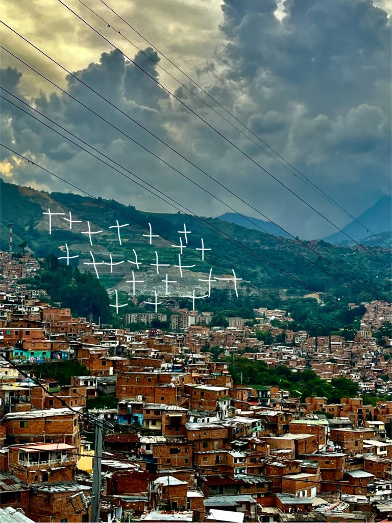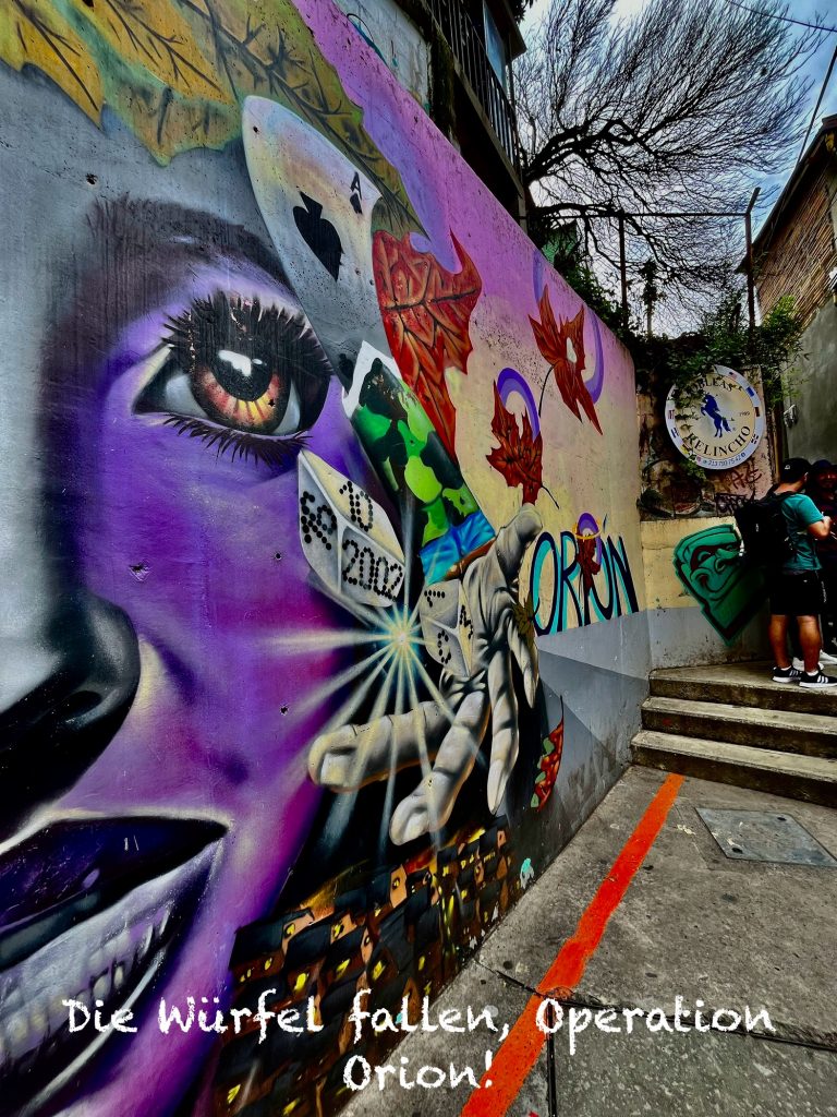 2002 ist dann das Jahr der Wende. An der Comuna 13 wird ein Exempel statuiert. Die Operation „Orion“ beginnt am 16. Oktober 2002. 4 Tage wird das Gemetztel andauern. Der kürzlich gewählte, ultrarechte Präsident Álvaro Uribe, schickt 1.500 Soldaten und Polizisten, Militärhubschrauber und gepanzerte Wagen in das Kriegsgebiet und lässt auf alles schießen was sich bewegt. Auch arbeitet die Regierung mit paramilitärischen Einheiten zusammen. Unzählige finden in diesen Tagen den Tod, auch viele Zivilisten. Das Paramilitär recht sich an vielen unliebsamen, linksgerichteten Personen. Viele Opfer werden auf besagter Bauschuttdeponie verscharrt und bleiben verschwunden.