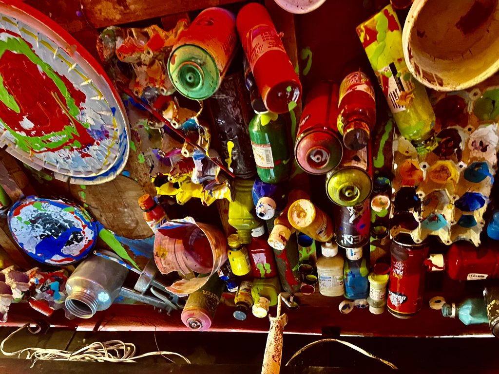 Er hat seine ersten Sprühdosen, Farben und Malutensilien als Deko an die Decke gebracht.