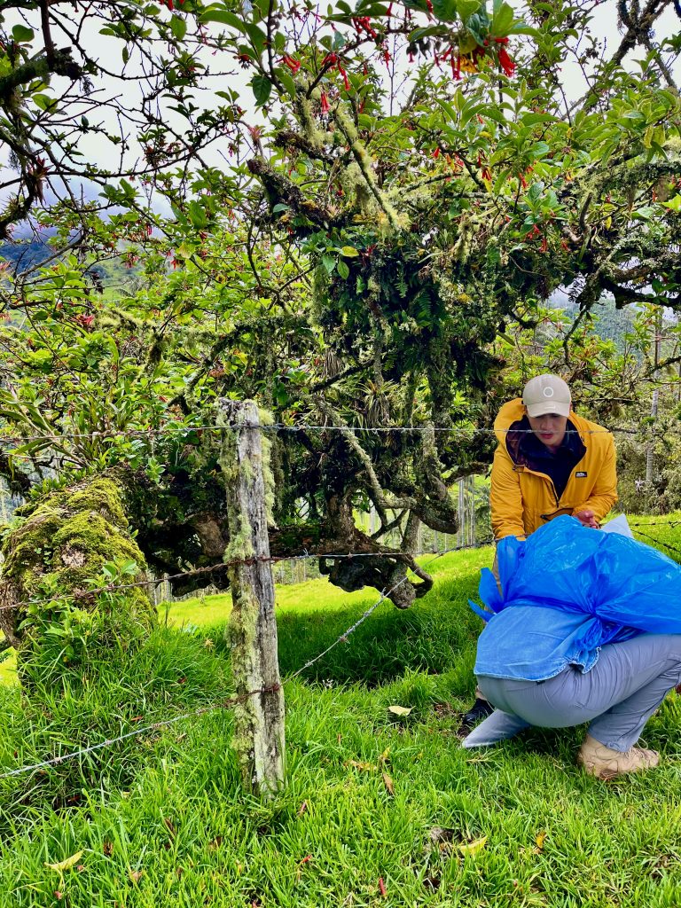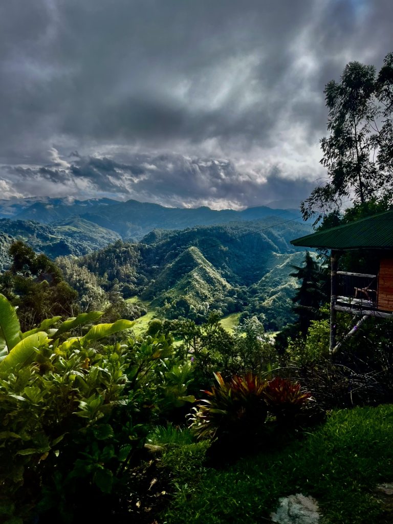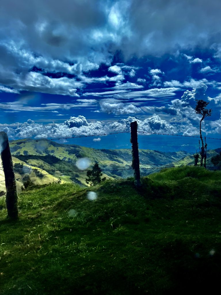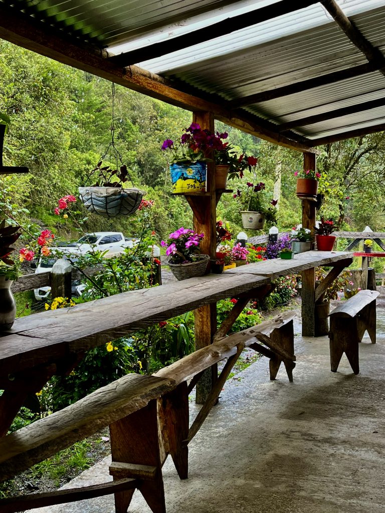 Wir packen das junge Pärchen mit ins Auto, er, Englisch-Kolumbianer, sie, Französin, beide sprechen fließend Spanisch, Englisch und Französisch und leben in den USA. Das kann uns noch zugute kommen, denn unser Guide kann nur ein paar Standardsätze in Englisch, da könnten sie uns dann übersetzen. Aber jetzt wird’s eng im Auto, da muss unser Guide auf die Ladefläche. Er nimmt sein Tablett mit und setzt sich auf einen Sitzsack. Geht doch. ☺️ Nun kommt’s! Die Strecke ist ein Alptraum! Wir rumpeln über Stock und Stein, durch Matschepampe bis direkt in die Nebelwolken hinein. Dort fängt es dann auch noch an zu regnen. Unser Guide verkriecht sich unter einer festen Plane. Ach herrje, aber er scheint es gewohnt zu sein. Die Jungs machen diese Tour JEDEN Tag! Unglaublich !! Zwei Stunden geht diese Rumpel-Holper-Klapperfahrt. Zum Glück wird niemandem schlecht. Wir ruckeln bis auf 3.378 Meter hoch, …