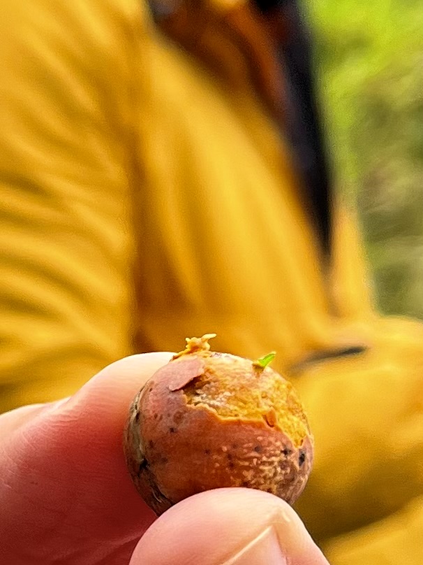 Das ist dann ja eine sehr langwierige Geschichte, bis die 60 Meter mal erreicht sind. Da brauchen sie dann schon hunderte von Jahren. Wenn sie dann sterben, fällt erst einmal die Palmenwedelkrone herunter, der Stamm steht danach noch ca. weitere 2 Jahre, bis auch er umkippt und verrottet. Wenn man die Palmenfrucht nicht keimen lässt, sondern aufbricht, sieht sie aus wie eine klitzekleine Minikokusnuss und schmeckt auch so.