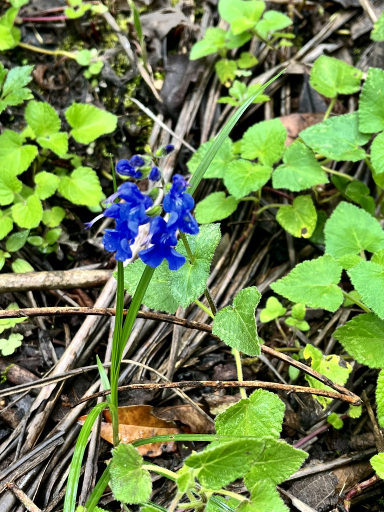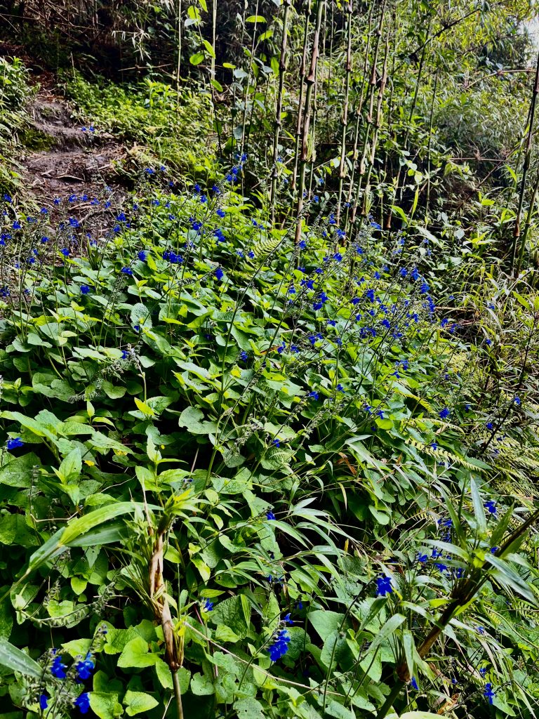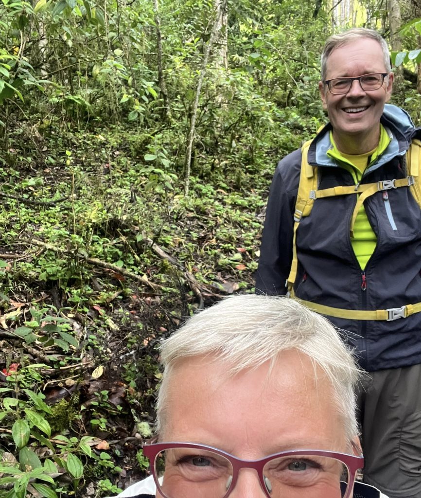 Die heutige Wanderung führt uns ausschließlich bergab. Das ist in der Tat nicht so anstrengend wie die gestrige Tour, aber es ist recht steil, es gibt keine wirklichen Wege, sondern nur rutschig-schlammige Kuhtrampelpfade über klitschnasse Wiesen. Auch wieder eine Herausforderung. Zum Glück auch für das jüngere Paar. 😅 Immer wieder kommt einer von uns ins Rutschen, jippie. 🥳 Aber nur ein bisschen…