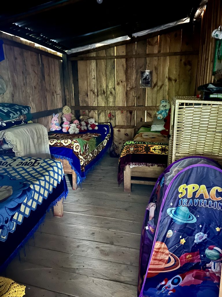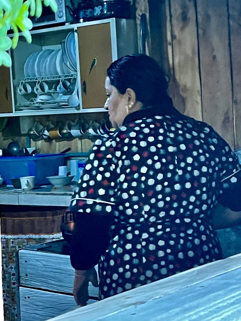 Und auch nicht diese hübschen blauen Blümchen. 😁 So, wir sind wieder oben zurück in der Hütte und dürfen Platz nehmen. Es gibt als Vorspeise Gemüsesuppe, als Hauptgang Schweinefleisch mit Gemüse und Maistalern. Zum Trinken reicht man uns frisch gepressten Obstsaft. Alles schmeckt ausgezeichnet. 😋 Wer will kann auch noch einen Kaffee bekommen. Wir unterhalten uns gut mit den beiden anderen und beömmeln uns köstlich darüber, wie gebannt sowohl die Köchin, ihre Gehilfin (Tochter) und unser Guide samt Fahrer, der gerade laufenden Telenovela folgen. Sie starren wie gefesselt, sehr lustig ! 🤣 Diesen Moment nutze ich, um den Raum hinter mir abzulichten, das Schlafzimmer.