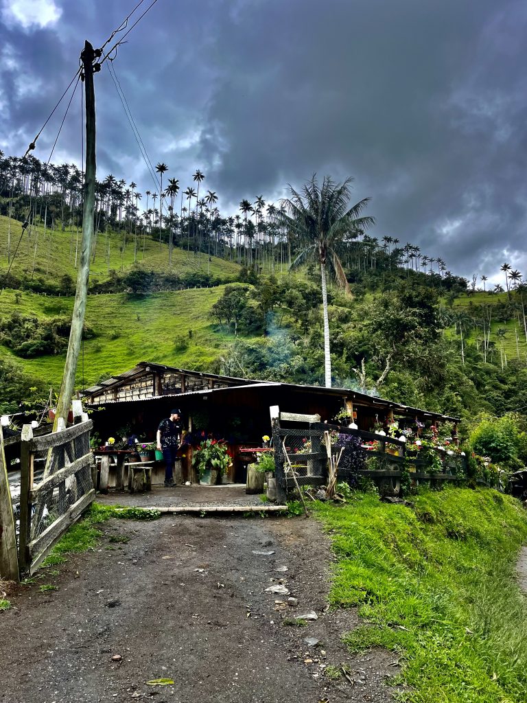 Ein ziemlich verzauseltes Pärchen mimt hier die Aussteiger. Wenn’s gefällt?! Das gesamte Gelände mit Bergen, Palmen und Wiesen gehört 4 Brüdern, ist also in Privatbesitz. Zwei leben in den USA, die anderen zwei in Kolumbien, aber nicht vor Ort. Wir dürfen nur mit einer Sondergenehmigung hier sein, und die bekommen ausschließlich 2 Agenturen. Eine davon ist die, mit der wir jetzt gerade unterwegs sind. Das soll dem Massentourismus einen Riegel vorschieben. Klappt ja auch, die zwei Verschrobenen sind die einzigen, die uns auf unserem Weg ins Tal begegnen werden.