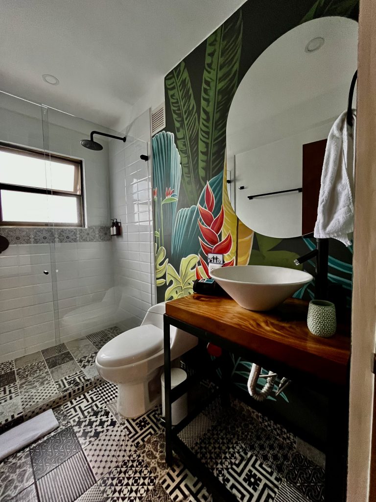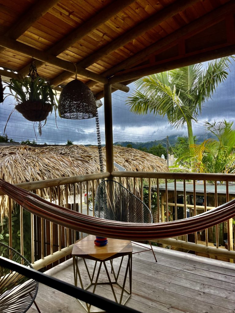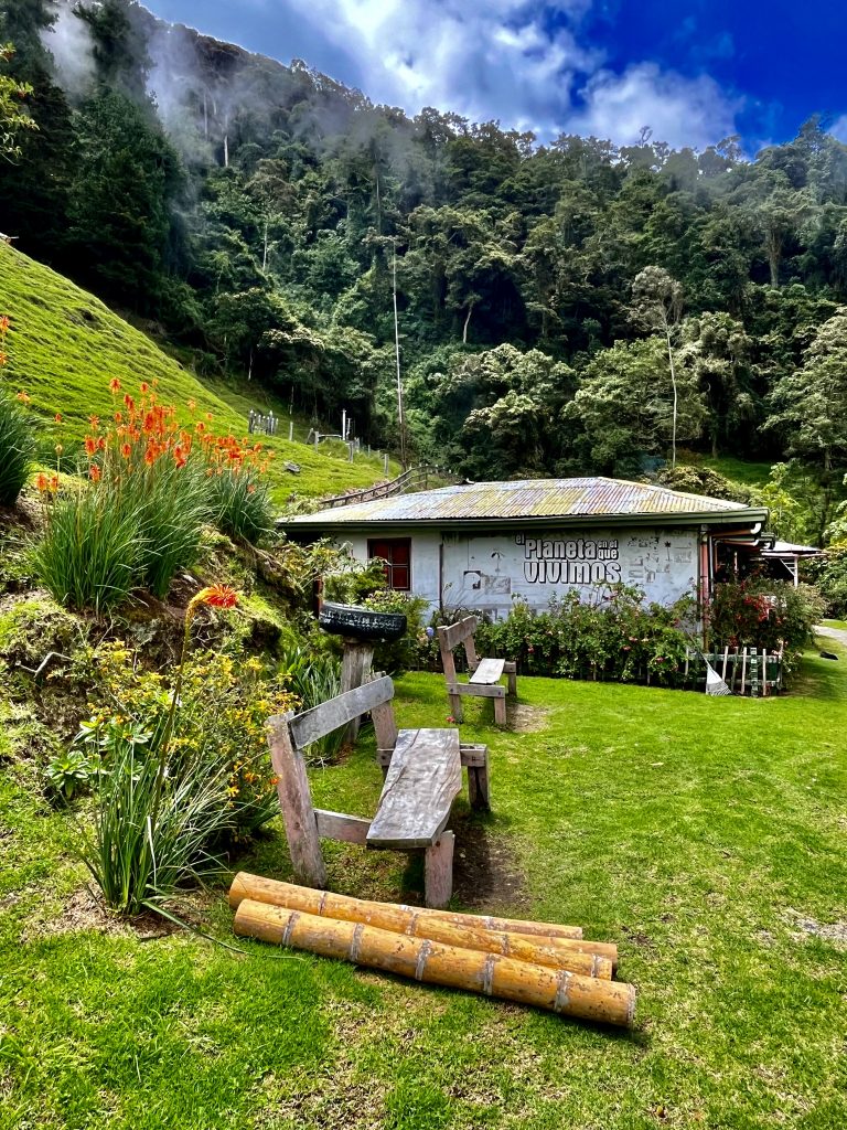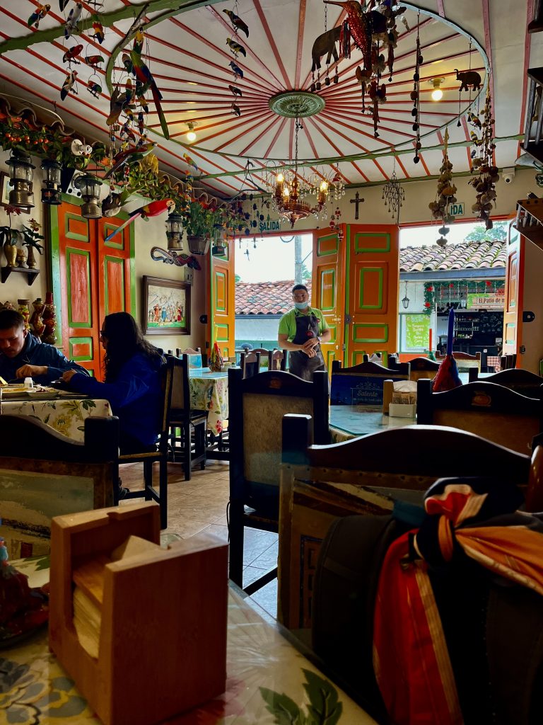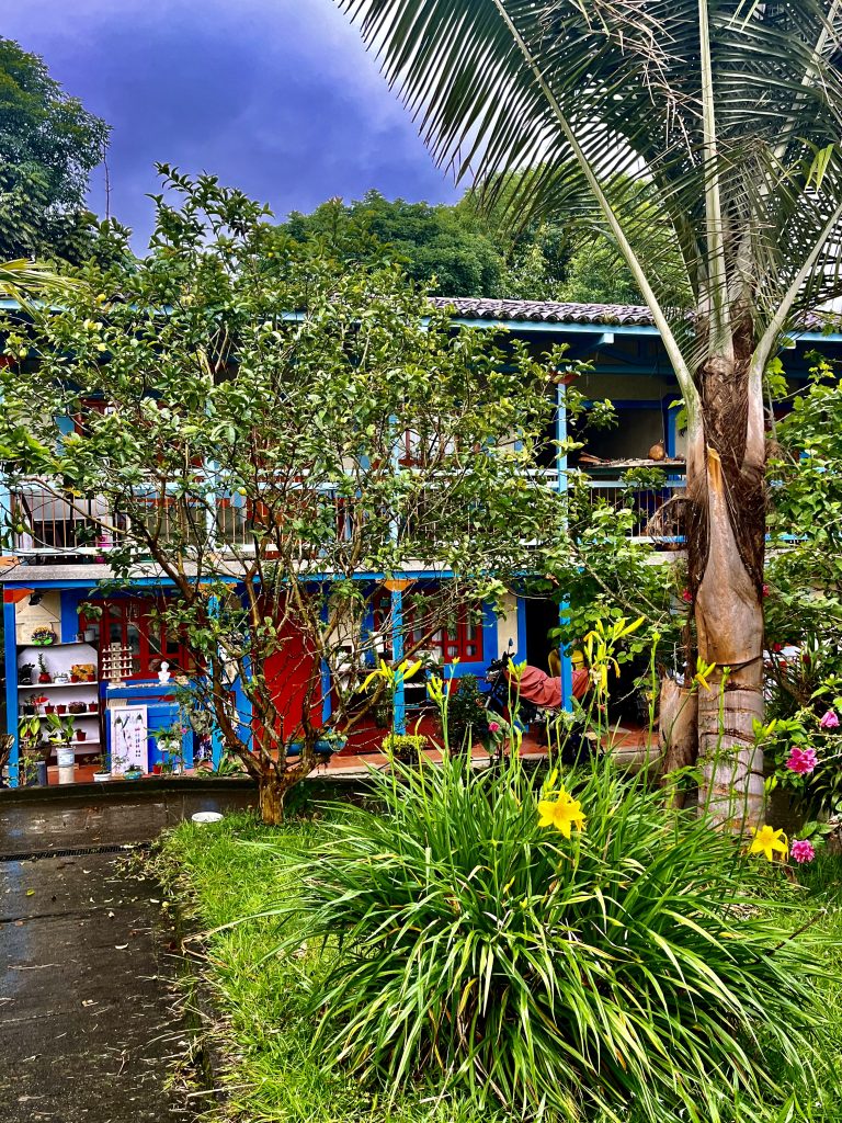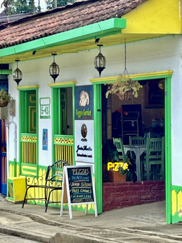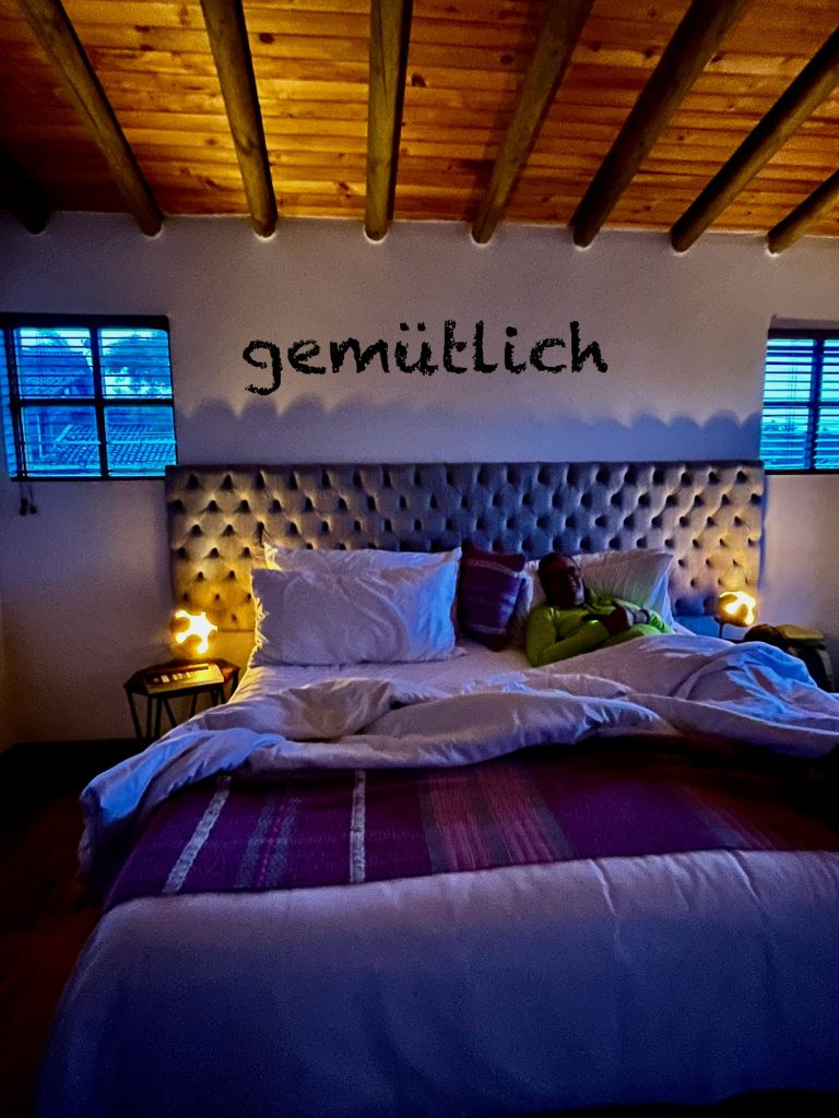Auch die Toilettengestaltung ist etwas Besonderes. Das Wichtigste aber ist, das Essen schmeckt richtig gut. 👍 Die Empfehlung hat sich gelohnt. Zufrieden, müde und satt geht’s jetzt zurück und ins gemütliche Bett. Wir müssen uns schleunigst regenerieren. Morgen erwartet uns eine sauanstrengende Wanderung durch das Tal der Wachspalmen mit dem Erklimmen einer Berghütte auf 2.860 Metern. Das heißt, 450 Höhenmeter müssen wir packen, so oder so! Stopp❗️Eben fällt‘s mir noch ein! Wir sollten uns doch noch das echte Künstlerdorf gleich hinter unserem Hotel anschauen… Naaa guuut. Dann laufen wir halt nochmal an unserem Hotel vorbei, treffen eine Rabenkrähe, …