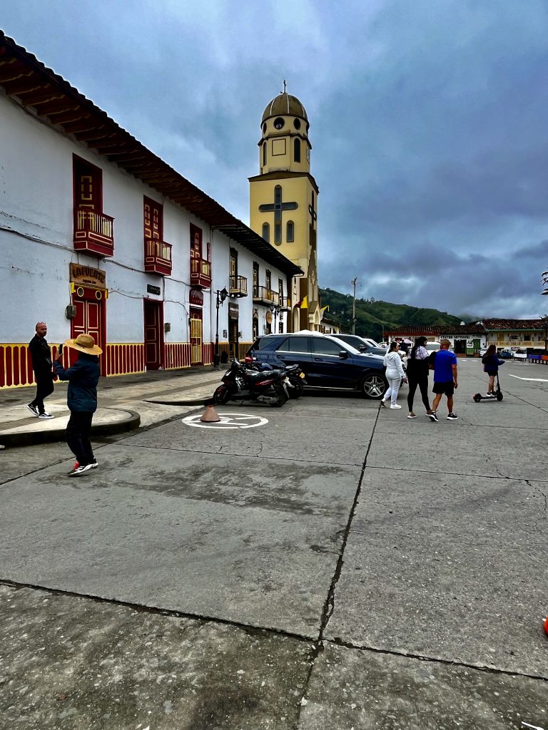 Bei all dem Angebot haut‘s auch schon mal nen Hund um, bum! 😳 Nee, der ist einfach nur faul und wartet auf Streicheleinheiten. Also von mir nicht! Wir schlendern weiter zum Hauptplatz, dem Plaza Bolívar, mit seiner Kirche Nuestra Señora del Carmen. Herr Bolívar war einst ein ganz besonderer Mensch, führte er doch auf dem südamerikanischen Kontinent mehrere Befreiungsschlachten gegen die spanische Kolonialmacht. Er befreite Ecuador, Venezuela und Kolumbien mit dem dazugehörigen Panama und führte sie zu Großkolumbien zusammen. Er gilt als DER Befreier schlechthin. Später, wie wir ja wissen, zerfiel dieses Großreich wieder durch viele Streitigkeiten in die uns bekannten Länder. Viele Statuen gedenken und ehren ihn bis heute, wie auch auf diesem Platz in Salento.