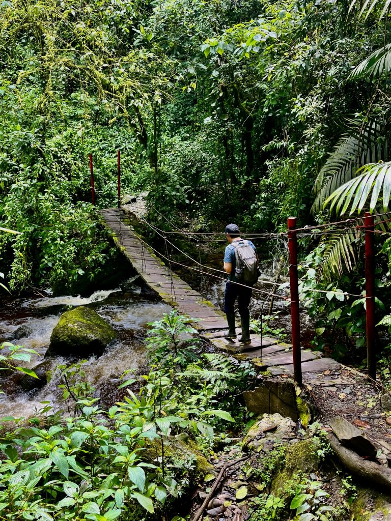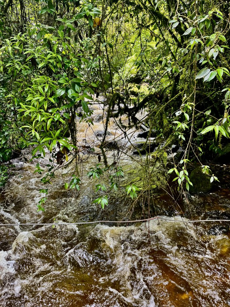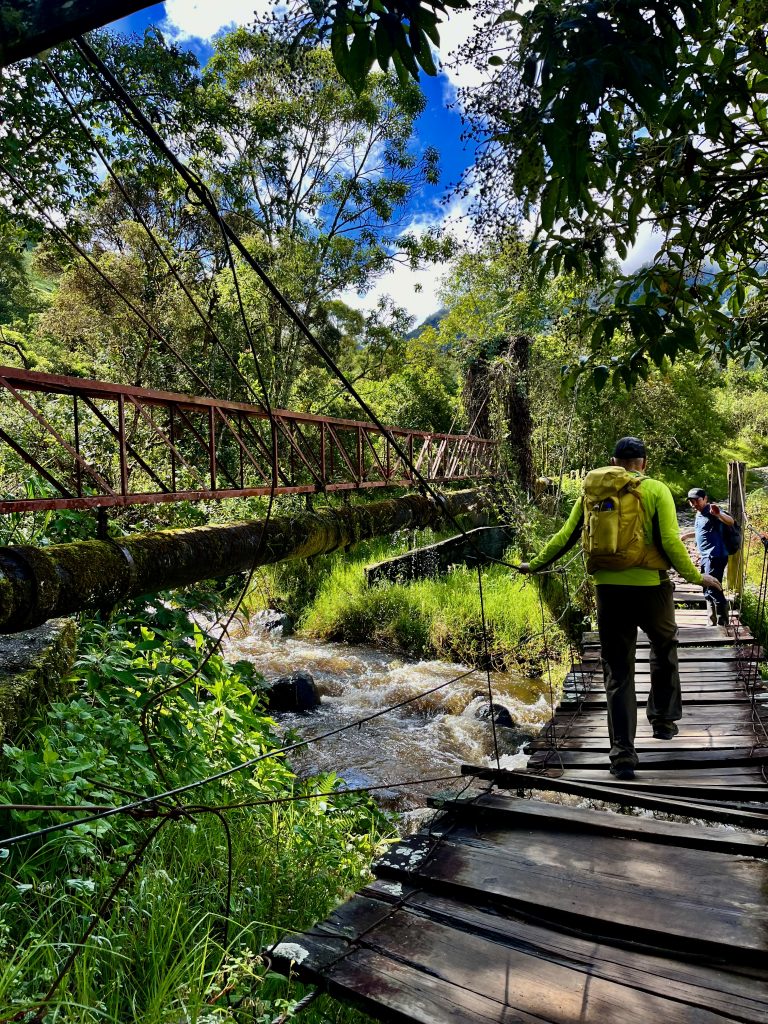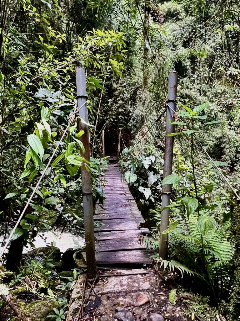 Zuerst ist die Wanderung durchaus moderat. Aber, es müssen 450 Höhenmeter über die nächsten 6 Kilometer überwunden werden, dazu noch mit Hilfe 6 wackeliger Hängebrücken, ein reißender Fluss überquert und etliche Pfützen, Schlamm, Matsche und Felsen bewältigt werden. Danach geht‘s dann 6 Kilometer wieder runter. Wohl bekomm’s…