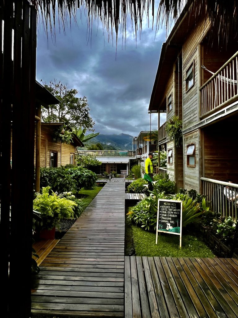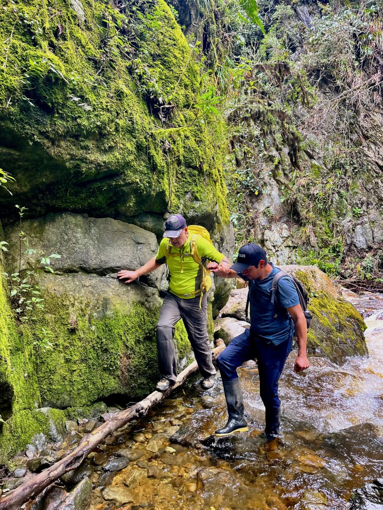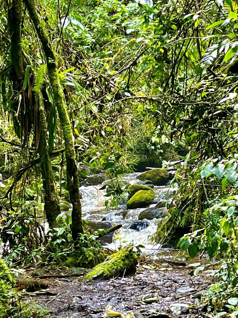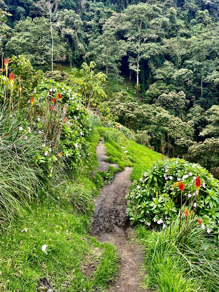 Zuerst ist die Wanderung durchaus moderat. Aber, es müssen 450 Höhenmeter über die nächsten 6 Kilometer überwunden werden, dazu noch mit Hilfe 6 wackeliger Hängebrücken, ein reißender Fluss überquert und etliche Pfützen, Schlamm, Matsche und Felsen bewältigt werden. Danach geht‘s dann 6 Kilometer wieder runter. Wohl bekomm’s…