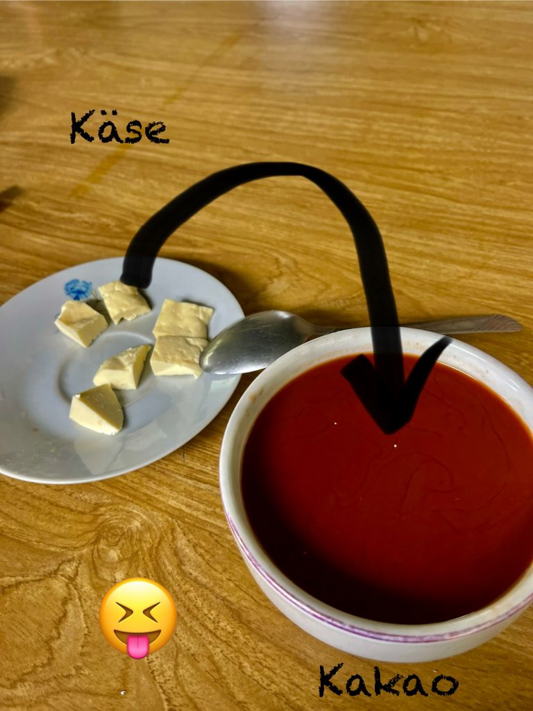 Also, erstmal hat es mich etwas geschüttelt, ob der Kombination. Aber dann muss ich sagen, diese Kombi schmeckt gut. Rogelio erklärt: Diese Kombination ist aus der Not geboren. Was hatten die Bergbewohner zur Verfügung? Kakao, jepp✅, Milch, jepp✅, Käse, jepp✅. Der Käse ist allerdings sehr mild und wird durch den heißen Kakao weich, löst sich aber nicht auf. Man hat was zum Kauen, es schmeckt süß, aber nicht zu süß und man bekommt etwas Warmes in den Bauch. Keine schlechte Kombi. Sie hat sich bis heute erhalten und wird von allen regelmäßig genossen. Ja, ich würde es nochmals bestellen. Klaus auch❣️ Sooo, die Pause war guuut! Wir müssen aber wieder los, die Wolken formieren sich, und wir wollen gerne noch trockenen Fußes zurückkehren. Allahopp 👏.