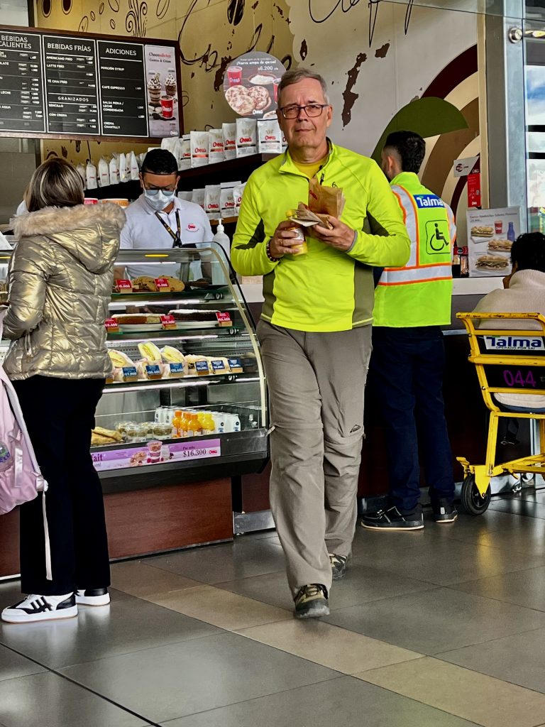 Auch bekommen wir wieder ein Frühstückspäckchen mit auf den Weg und heben überpünktlich mit dem Flieger ab. Perfecto! Ebenso überpünktlich landen wir in Bogotá. Das ist auch gut so, denn wir sitzen in der allerletzten Reihe, gaaanz hinten und müssen noch den Anschlussflug erreichen. Und bis wir hier raus sind kann es dauern. Nerven bewahren! Aber es flutscht besser als erwartet. Sehr diszipliniert und flott und freundlich verlassen alle, auch wir, zügig das Flugzeug. So kommt unsereins pünktlich zum Boarding, sitzt nun in der 6. Reihe und hat sogar den mittleren Sitzplatz frei. Alles prima, alles paletti❣️Hm, aber weiter passiert nichts. Wir warten…, warten, beobachten das Flugpersonal, das sich entspannt unterhält, auch der Captain steht mit dabei. Es sieht nicht so aus, als würde es bald losgehen. Nach einer 3/4 Stunde wird klar, wir müssen wieder aussteigen, das Flugzeug hat unlösbare Probleme mit der Kommunikation. Dann mal wieder raus hier. Wir sitzen nun im Boardingbereich und harren der Dinge die da kommen… Hoffentlich verstehen wir die Durchsagen? Es wird nur auf Spanisch gesprochen. Eine Mitreisende bekommt unsere Unsicherheit mit und übersetzt uns alles auf Englisch. Super! Danke! Wie lässt sich Zeit am besten überbrücken? Natürlich mit Essen!! 😆