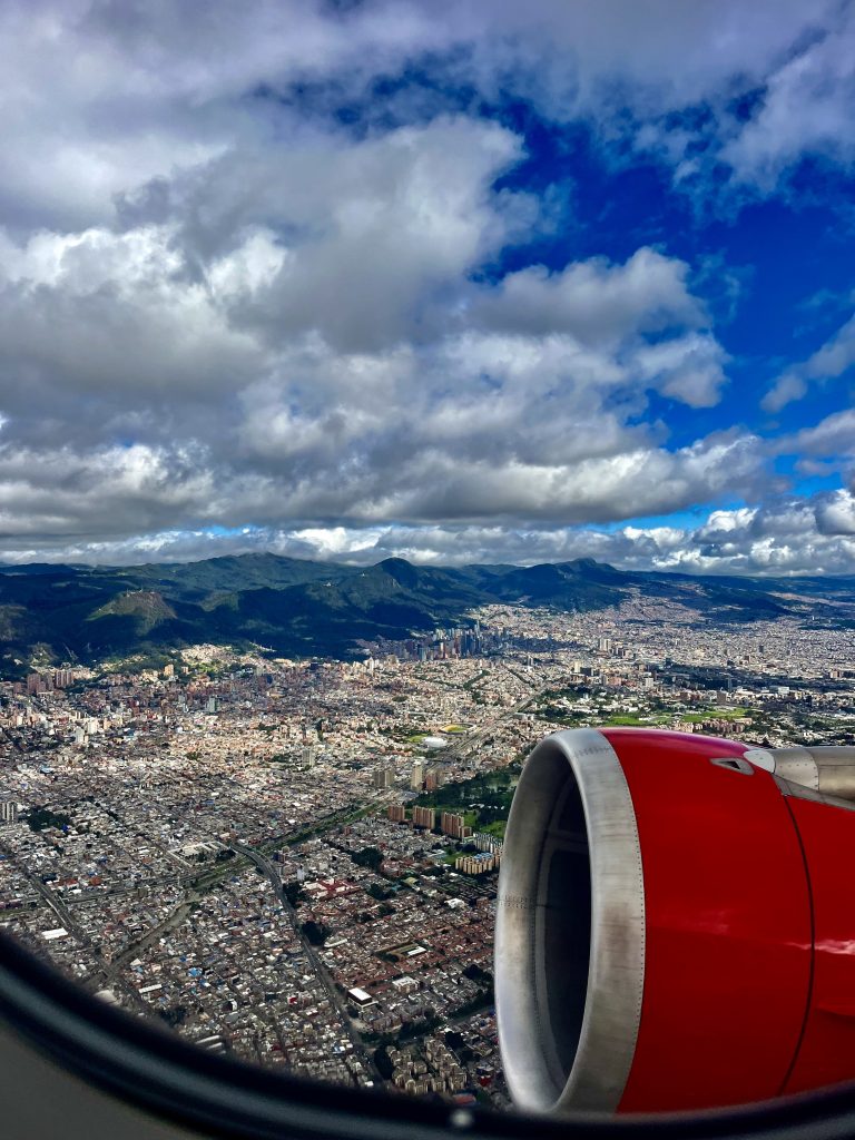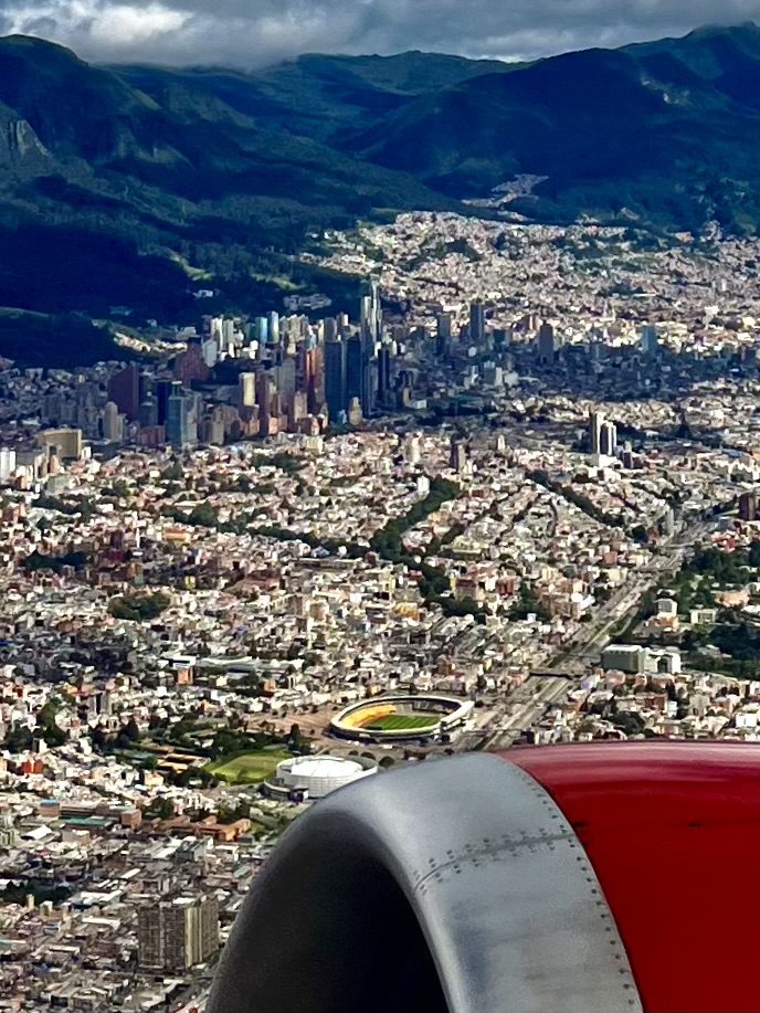 Später, viel später, müssen wir zu einem neuen Gate im Keller. Und 2 1/2 Stunden später sitzen wir in einem neuen Flieger und starten nach Barranquilla. Schnell noch wird unsere Organisatorin, Andrea, informiert, dass wir mit ordentlich Verspätung ankommen werden. Dann werfen wir noch flott ein paar Blicke auf Bogotá, zumindest von oben.