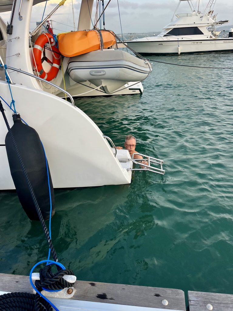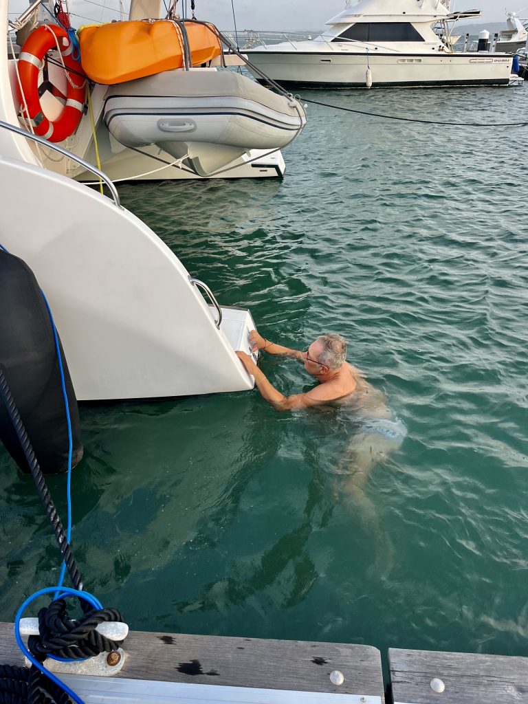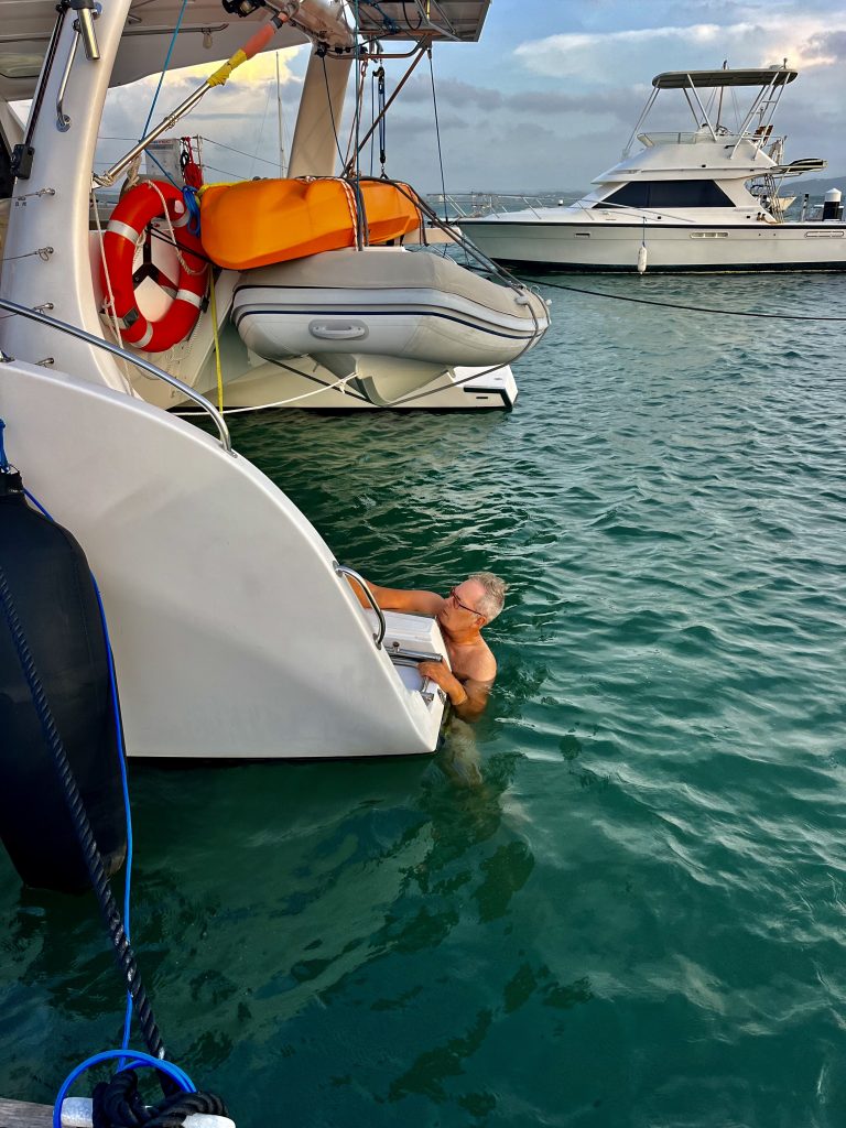 Nun sind wir zurück. Yuti ist anders vertäut, als wir sie verlassen haben. Es muss wohl viel Wind aufs Land gedrückt haben. Zusätzliche Mooringleinen sichern das Boot. Gut! Aber so kommen wir definitiv nicht an Bord. 😳 Yuti scheint eingeschnappt zu sein und hält stur Abstand zum Steg und zu uns. Auch mit 3 Mann lässt sie sich nicht ziehen oder bitten. Phhhh…