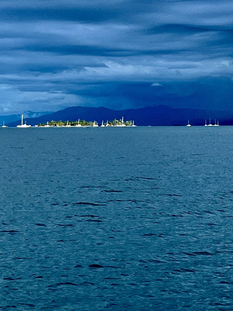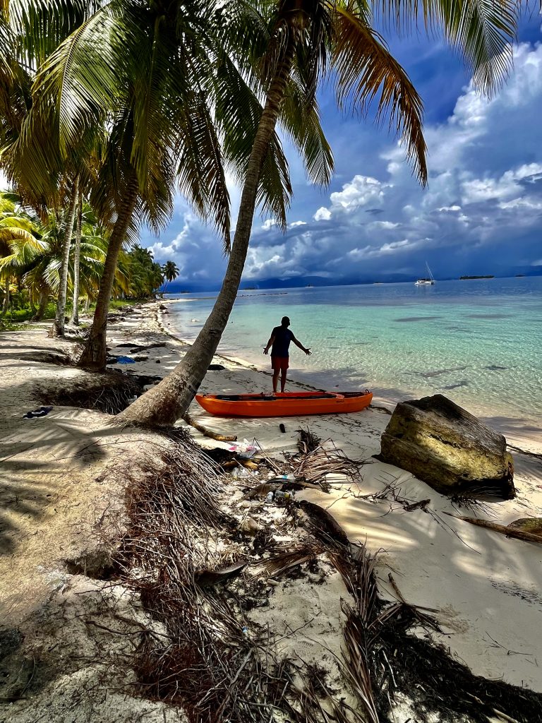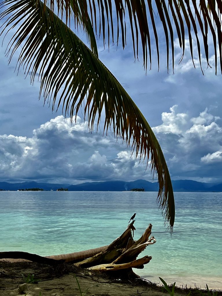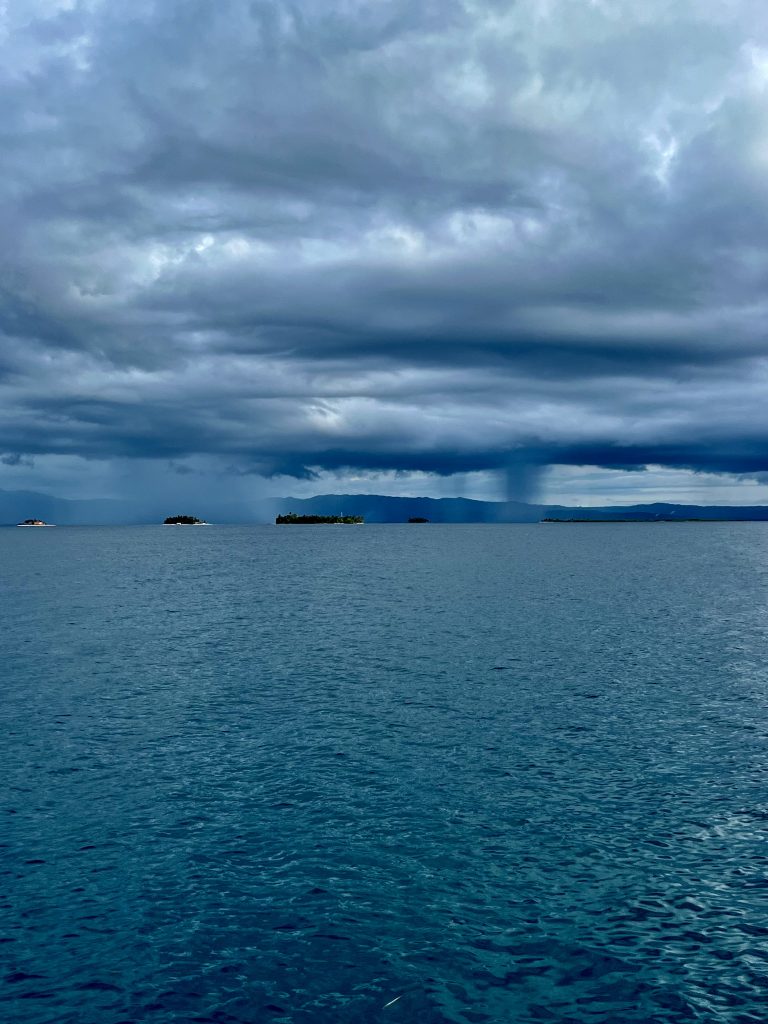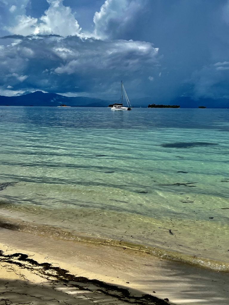 Da ruft eine kräftige Frauenstimme, olà! Mola Lisa stellt sich vor. Die berühmte Mola Lisa, die weit über die Grenzen für ihre feinen Mola-Arbeiten bekannt ist. Wir hatten auch schon von ihr gehört. Jepp, was soll ich sagen, wir kaufen. 😉 4 Molas und zwei bestickte Pads wechseln den Besitzer, ebenso 100 US-Dollar. So, jetzt reicht‘s aber, stöhnt Klaus, sonst sind wir innerhalb von 48 Stunden pleite. 🫣 Ich ziehe mich zügig zurück und gehe schnorcheln. 🤿 Mal sehen, was das näheste Riff so zu bieten hat? Joo, ist ganz nett, wenn auch nicht viele Fische zu erhaschen sind. Toll sieht es aus, wenn abgefallene Palmenwedel urplötzlich am Grund auftauchen, oder gar ganze Baumstämme sich sanft in den Wellen wiegen, als wären sie leicht wie Federn. Witzig auch, wie abrupt die Wassertemperatur zwischen erfrischend bis heiß wechselt. Für heute war’s das… Schnell noch ein Blick rüber zu den Gewittersqualls,…