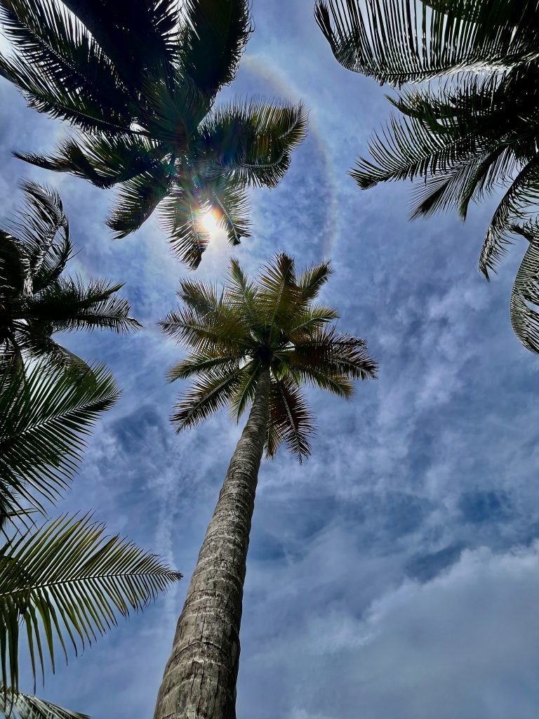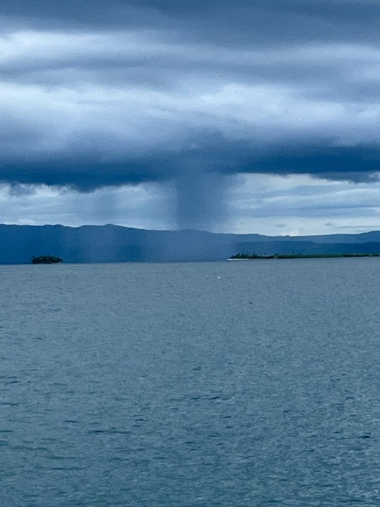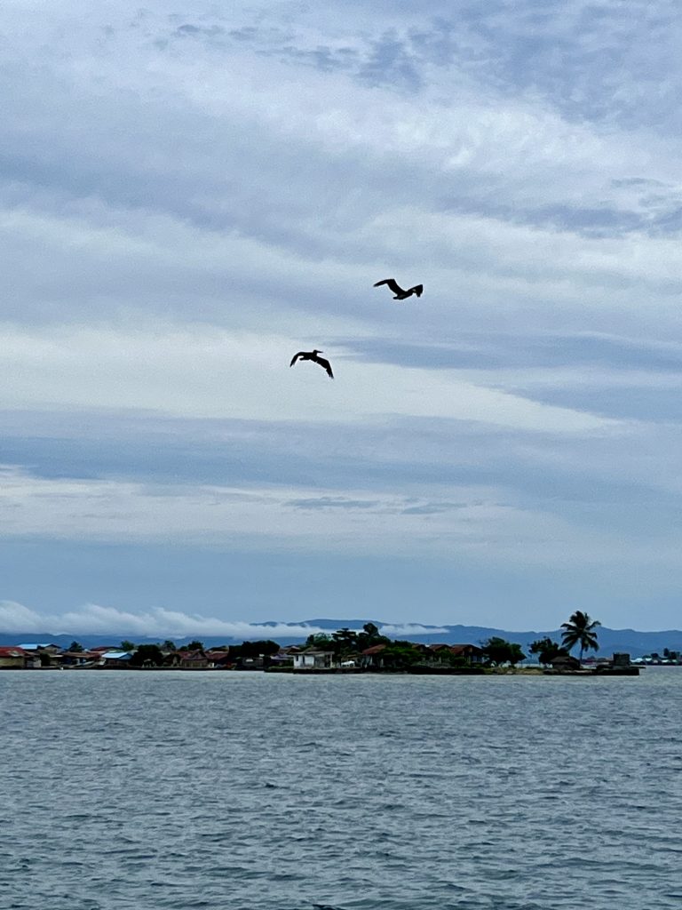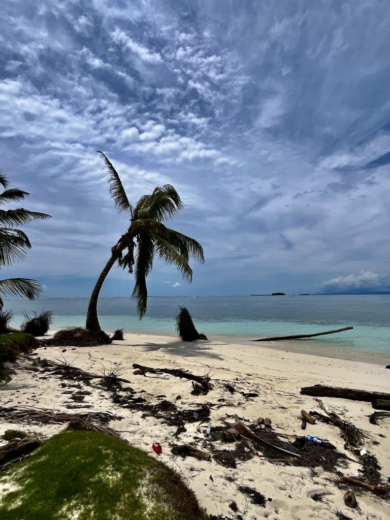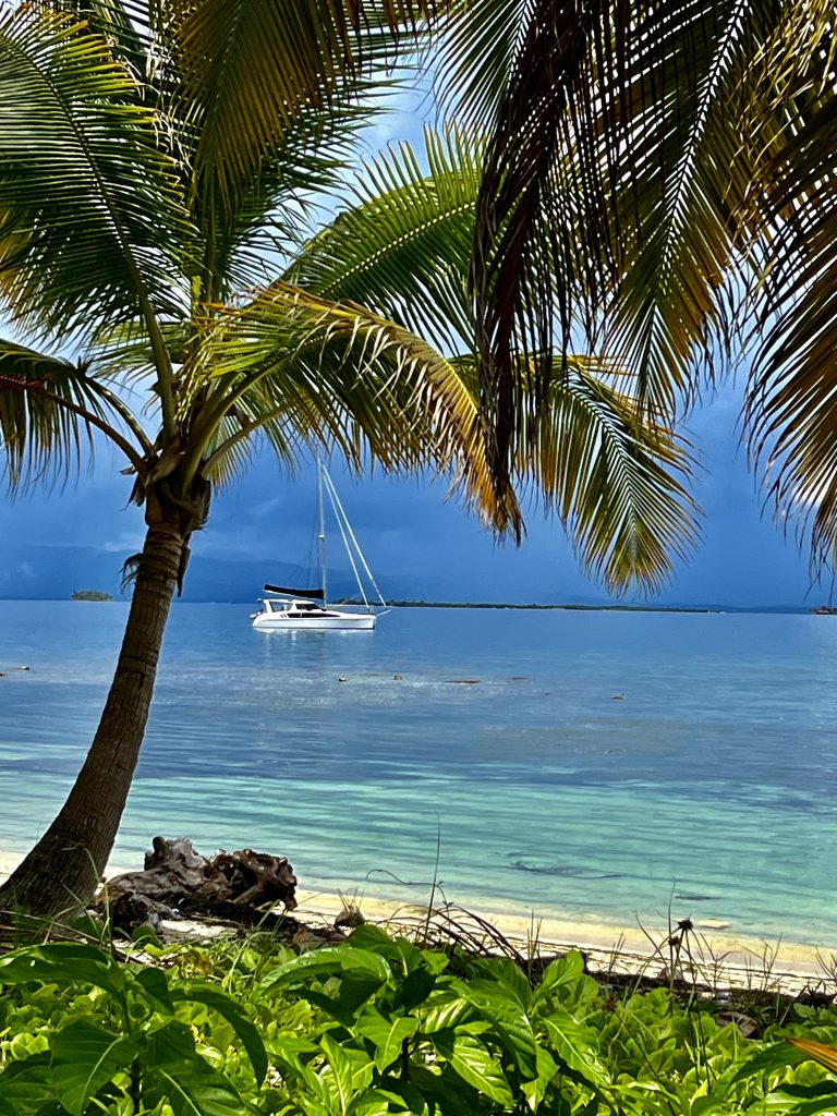 Da ruft eine kräftige Frauenstimme, olà! Mola Lisa stellt sich vor. Die berühmte Mola Lisa, die weit über die Grenzen für ihre feinen Mola-Arbeiten bekannt ist. Wir hatten auch schon von ihr gehört. Jepp, was soll ich sagen, wir kaufen. 😉 4 Molas und zwei bestickte Pads wechseln den Besitzer, ebenso 100 US-Dollar. So, jetzt reicht‘s aber, stöhnt Klaus, sonst sind wir innerhalb von 48 Stunden pleite. 🫣 Ich ziehe mich zügig zurück und gehe schnorcheln. 🤿 Mal sehen, was das näheste Riff so zu bieten hat? Joo, ist ganz nett, wenn auch nicht viele Fische zu erhaschen sind. Toll sieht es aus, wenn abgefallene Palmenwedel urplötzlich am Grund auftauchen, oder gar ganze Baumstämme sich sanft in den Wellen wiegen, als wären sie leicht wie Federn. Witzig auch, wie abrupt die Wassertemperatur zwischen erfrischend bis heiß wechselt. Für heute war’s das… Schnell noch ein Blick rüber zu den Gewittersqualls,…